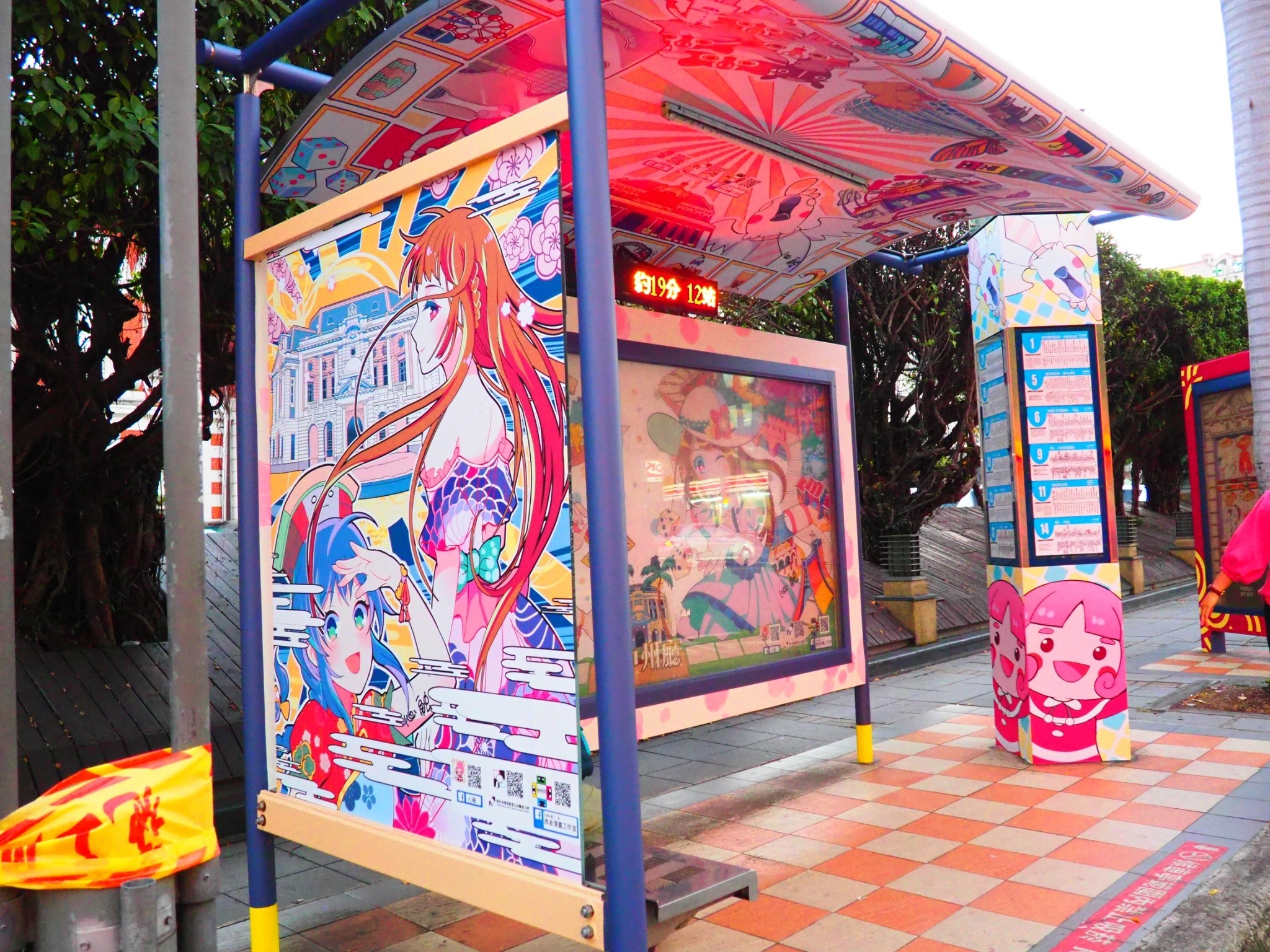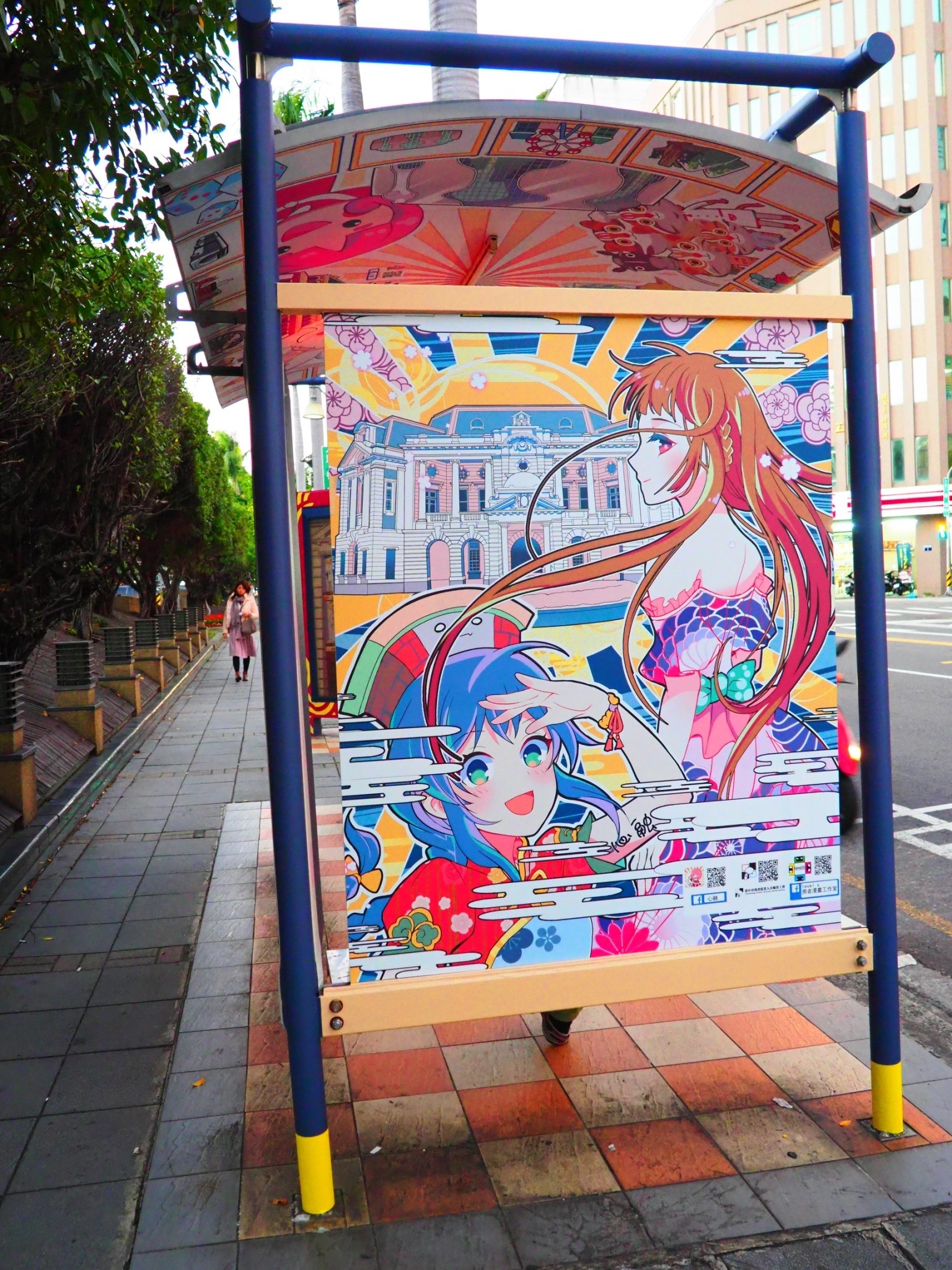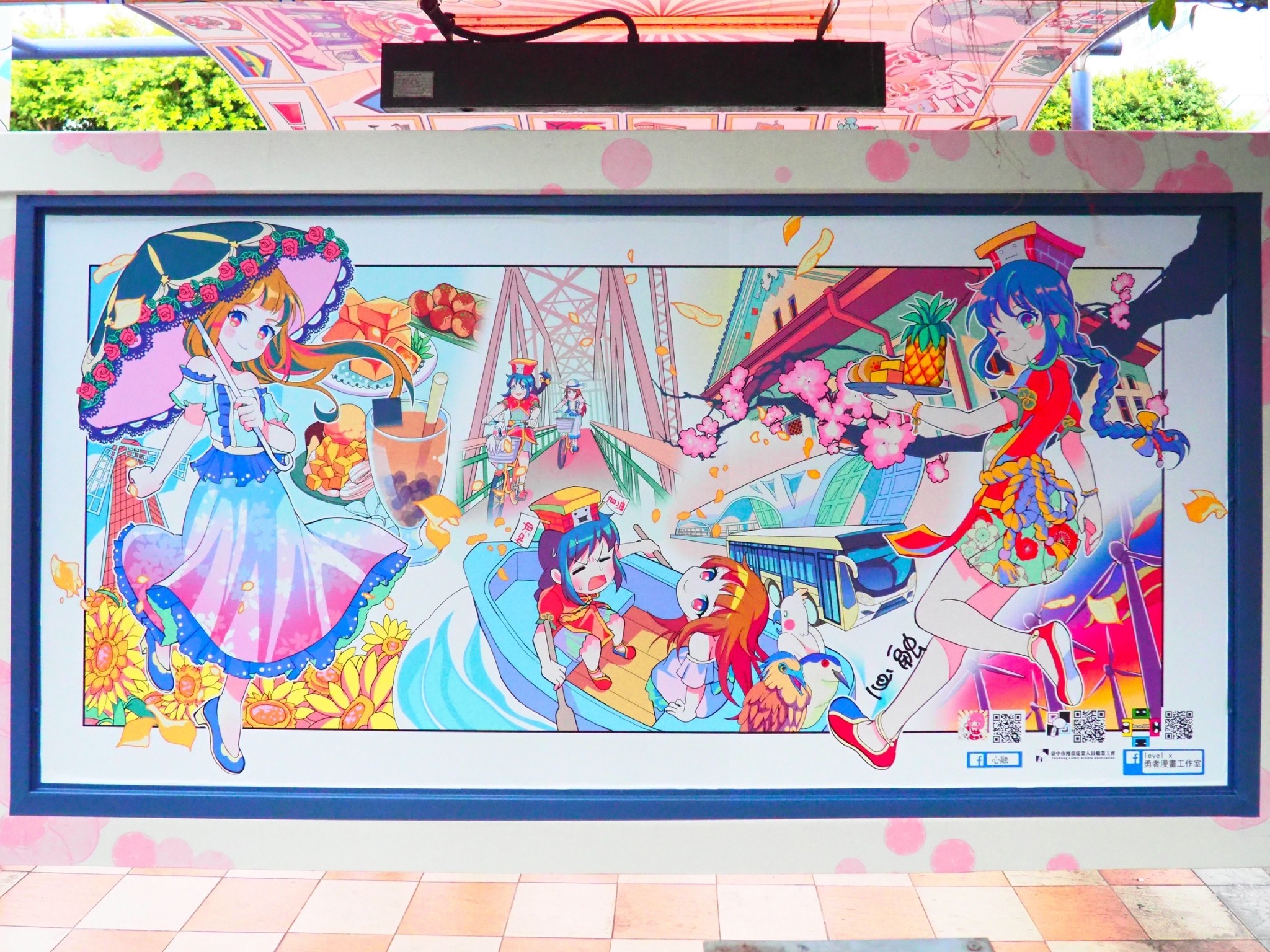 創意動漫公車候車亭今(18)日亮相!台中市政府與台中市漫畫從業人員職業工會合作,邀請台中在地漫畫家心融和RANDA在台中州廳站候車亭,以「台中逐跡,留下足跡」為設計理念進行站體創意施作,畫作內容遍及台中各大景點古蹟及美食,並融入大富翁遊戲的元素,設計5個擬人化的知名景點,可愛又吸睛。市府新聞局盼透過合作將漫畫角色融入公共空間,也提供在地漫畫家創作舞台,為城市再添新的拍照打卡熱點。
