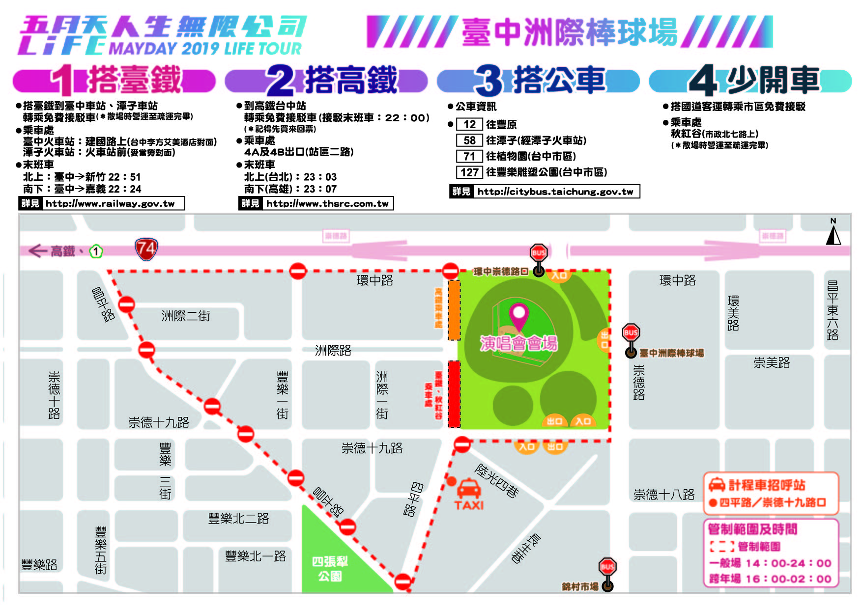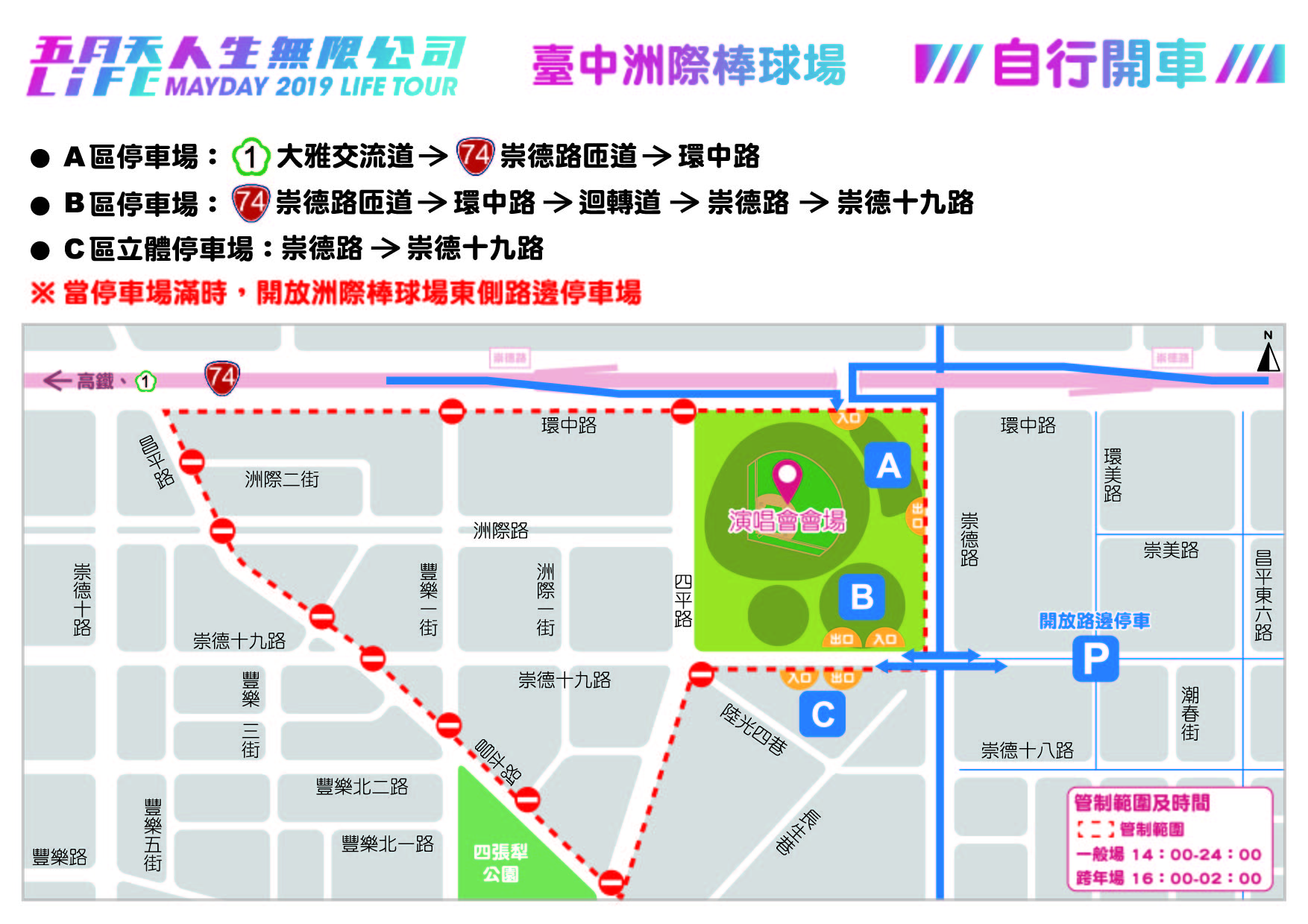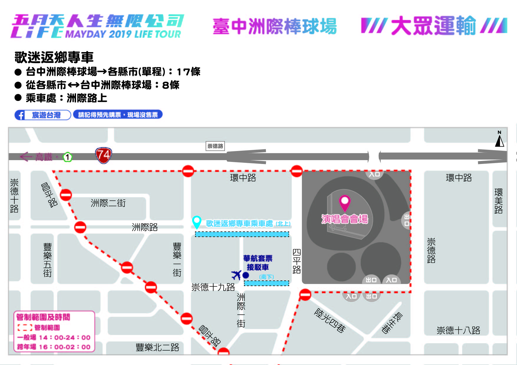 市府指出,活動當天四平路(環中路至昌平路段)、崇德十九路(崇德路至昌平路段)及洲際路(四平路至昌平路段)為管制區,禁止一般車輛通行及停車,以疏導洲際棒球場周邊交通。一般場管制時間為下午2時至24時,12月31日跨年場管制時間為下午4時至隔日凌晨2時,請開車前往的歌迷配合管制時間預先規劃行駛路線。