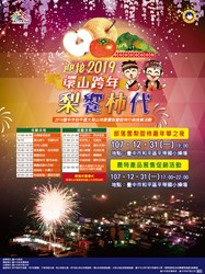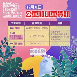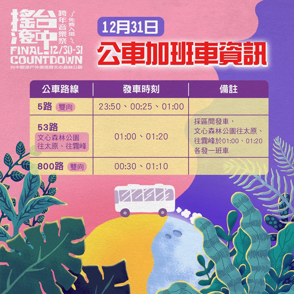 迎接新年,台中跨年晚會將分別於后里現場麗寶樂園第二停車場「2019依舊幸福 花現台中跨年晚會」,以及台中現場圓滿戶外劇場暨文心森林公園「搖滾台中 2019台中跨年音樂祭」,以雙主場方式盛大舉行。邀請伍佰、盧廣仲、四分衛、台中在地樂團等超強卡司接力演唱,后里現場更有跨年倒數摩天輪燈光秀,歡迎大家踴躍參加;跨年當天,在谷關及梨山也舉辦「2019搖滾谷關‧幸福梨山」跨年晚會,谷關場將邀請金曲獎最佳樂團「MATZKA」、小謝金燕「舒子晨」、綜藝玩很大金牌關主「黃豪平」及新時代女神「劉璇」與民眾跨年;梨山場則備有原民美食,邀請原民樂團帶來精采演出,千萬別錯過!