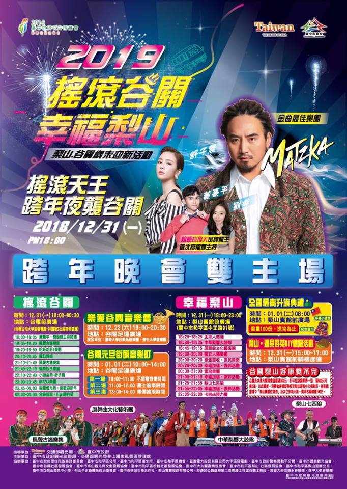 「2019搖滾谷關‧幸福梨山」跨年晚會中,谷關場的跨年將邀請MATZKA、舒子晨、黃豪平、劉璇、知名原住民表演團體「風聲古謠樂集」等輪番上陣,現場並規劃美食及互動遊樂攤位;梨山場跨年則邀請原舞曲文化藝術團、梨山七匹狼、雷滾樂團、獨立人種搖滾樂團等上場演出,現場也準備50隻原風鋼管雞、互動遊戲等,精采可期。