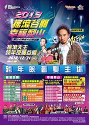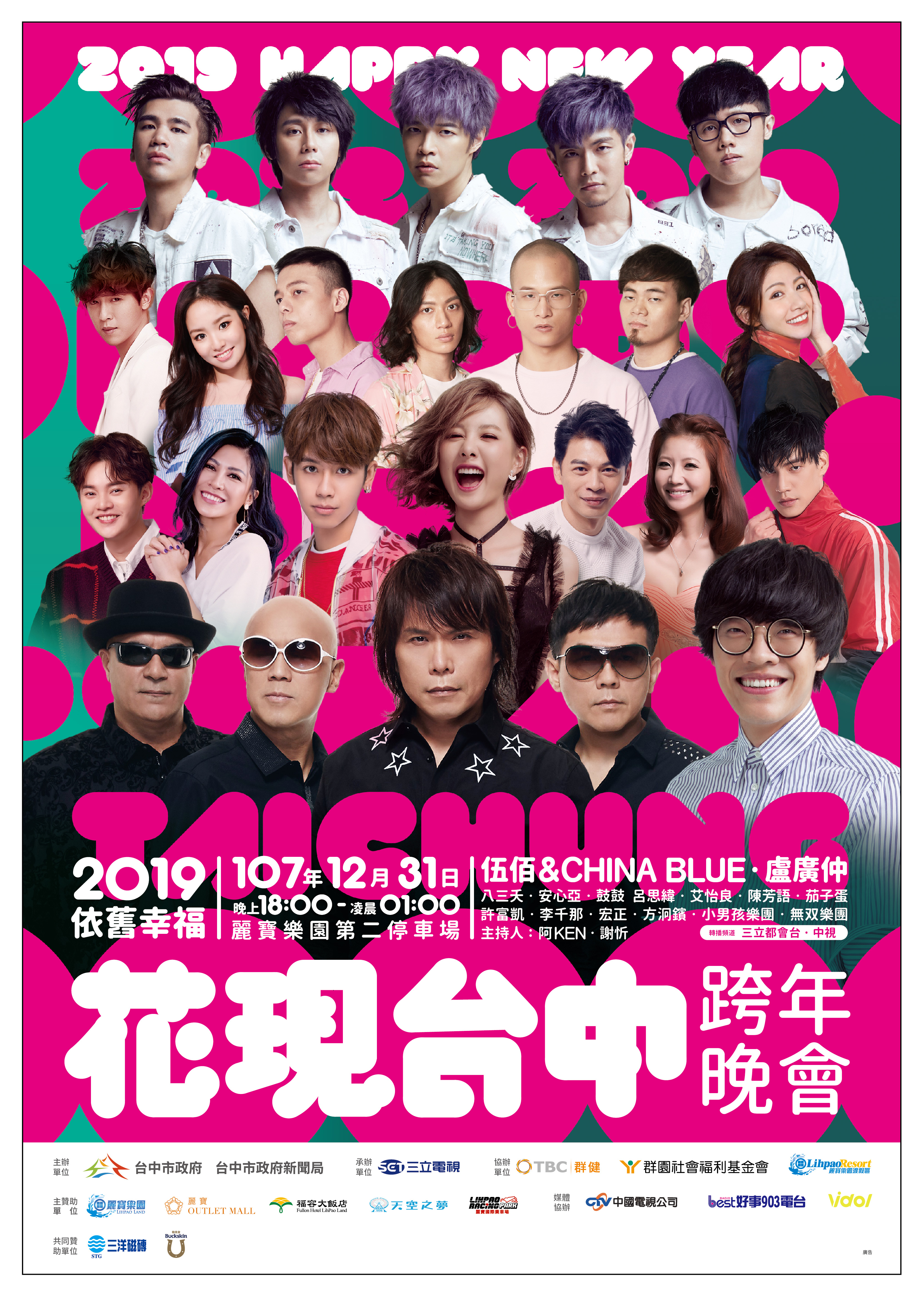 「2019台中跨年晚會」雙主場,分別是后里現場「2019依舊幸福 花現台中跨年晚會」,將於12月31日晚上6時在麗寶樂園第二停車場舉行,以及台中現場「搖滾台中 2019台中跨年音樂祭」,12月30日、31日下午1時在圓滿戶外劇場暨文心森林公園舉辦。