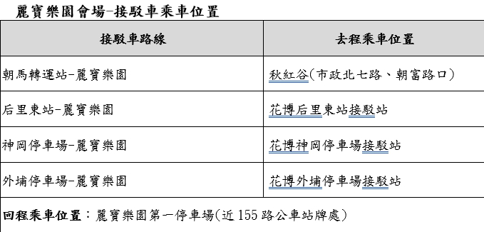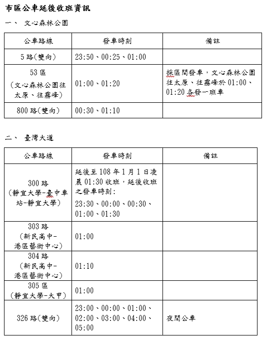 市府已協調公車加開班次,后里現場部分,於「麗寶樂園」公車招呼站之155(含副)路、215路、811路公車會配合於深夜時段依現場搭乘人潮加密發車班次;行經「文心森林公園」場地周邊公車招呼站位之5路、53路、800路公車,及行經臺灣大道之300路、303路、304路、305路公車配合延後收班,以利疏運。其中,300路公車最晚班次為1時30分發車,臺灣大道上除延後收班的優化公車路線外,還有深夜時段行駛的326路公車。