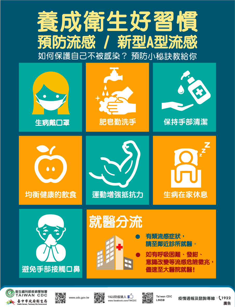 民眾如有就醫需要,可至衛生局網站首頁(http://www.health.taichung.gov.tw/),最新消息點閱本市醫院開設假日類流感特別門診時段,亦可瀏覽流感防治專區之「公費流感抗病毒藥劑合約醫療院所」,參考就醫訊息。更多資訊可至疾管署全球資訊網「流感專區」(https://www.cdc.gov.tw),或撥打國內免付費防疫專線1922洽詢。(1/17*6)*衛生局