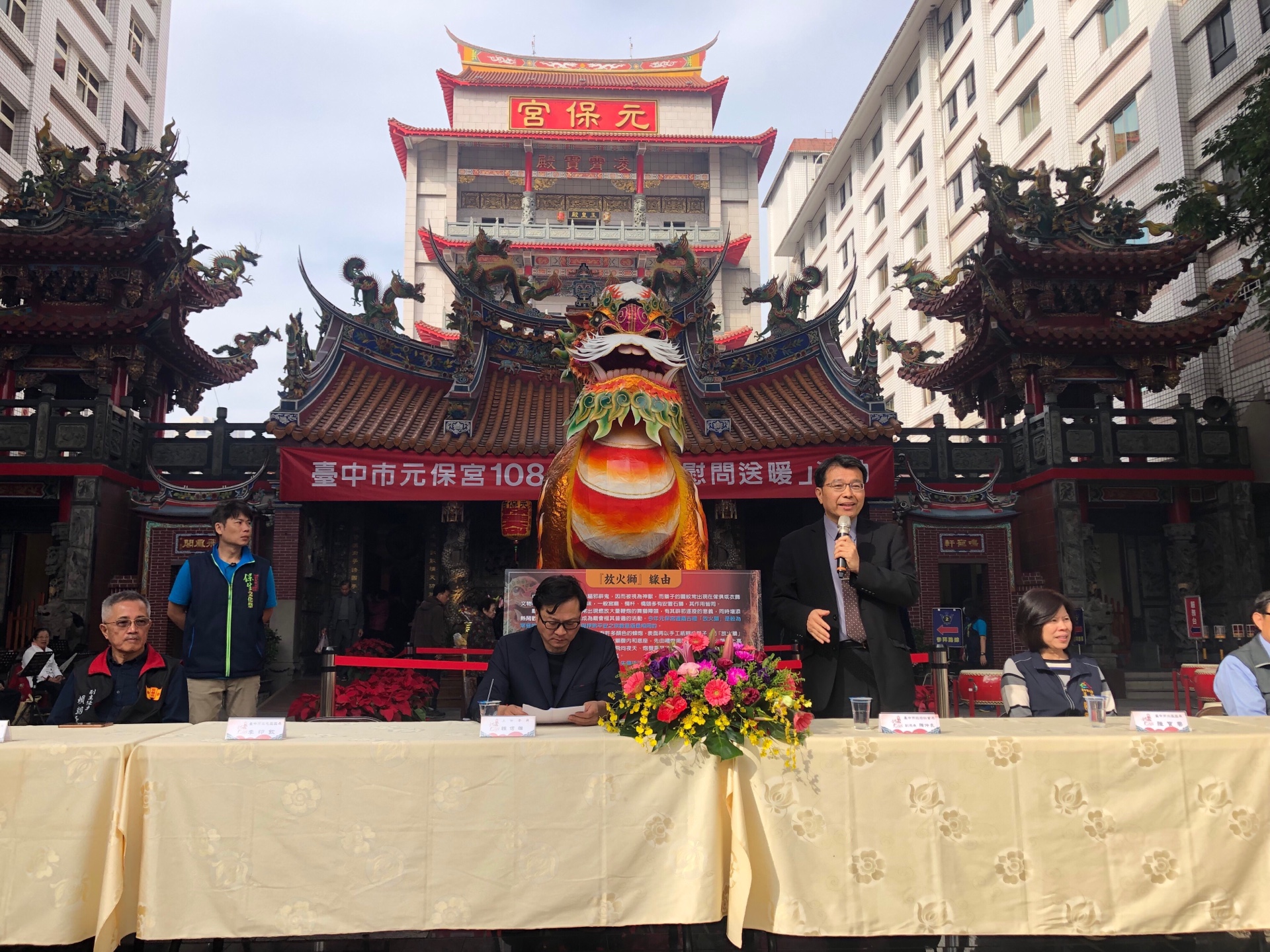 台中市元保宮秉持醫神保生大帝慈悲救世的精神,今日展開「108年度冬令慰問送暖活動」,提供民眾所需物資,希望保生大帝護佑人民。包括社會局副局長陳仲良、元保宮主任委員賴信雄等人共同為活動揭開序幕,現場還有太平國小太鼓樂隊帶來精彩表演,氣氛相當熱鬧。