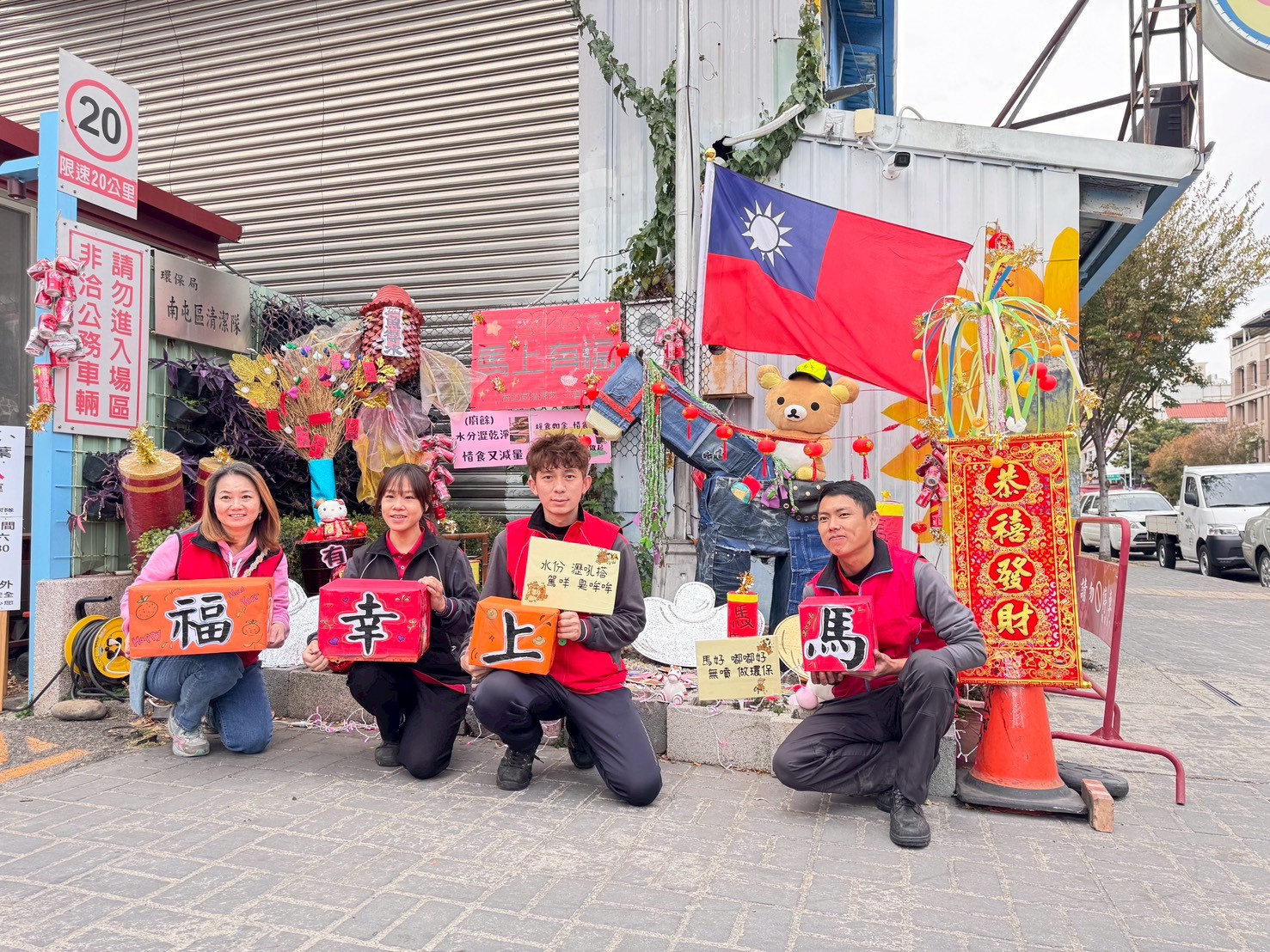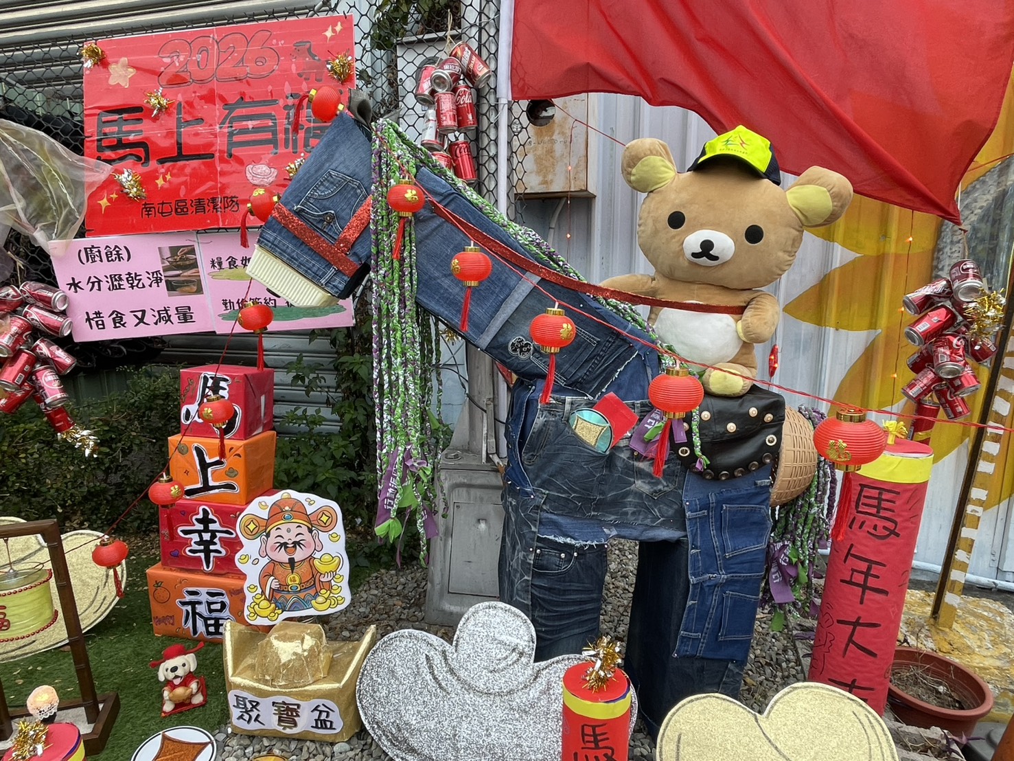 迎接馬年新氣象,台中市政府環境保護局南屯區清潔隊發揮巧思,在永春東路隊部門口打造充滿創意的春節裝置藝術「馬上幸福」。清潔隊員化身藝術家,利用回收紙箱打造馬身,更具巧思地將舊牛仔褲與廢棄選舉布旗裁剪拼貼成飄逸的馬鬃,拼組出栩栩如生的駿馬,展現資源回收再利用的無限可能。配合新春造景,南屯區清潔隊13031日和267日上午9時至12時,將舉辦「環保問答送好禮」活動,邀請民眾來觀賞答題拿好禮,共度綠色春節。