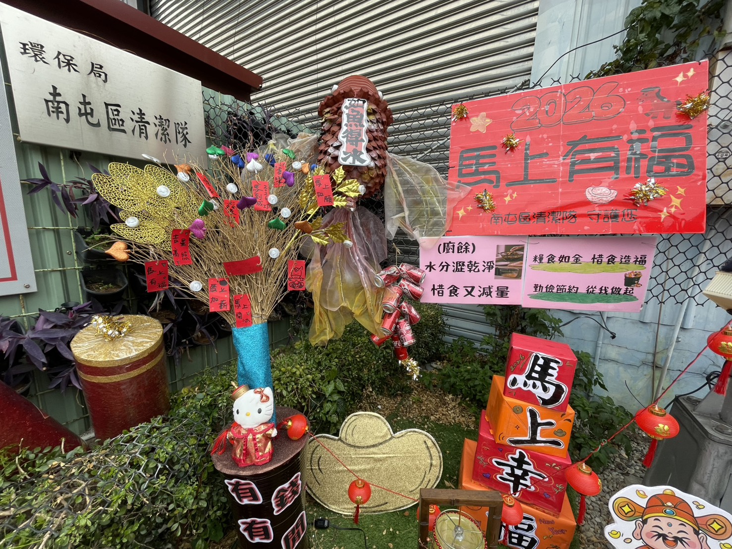 環保局長吳盛忠表示,今年是馬年,特別在隊部(永春東路1)門口製作1隻迷你牛仔馬「馬上幸福」,高約150公分、長約145公分,以用廢紙箱、牛仔褲、塑膠盒、塑膠籃,還有選舉布旗編綁成辮子做為馬鬃及馬尾,由可愛的拉拉熊駕馭,再利用道路清掃把,做成福扇,並以鋁罐裝扮成串小炮竹,以彩球及乒乓球裝點成2棵火樹銀花,熱閙非凡,利用各類回收廢料經過切割、彩繪與重組而成,象徵資源無限循環。