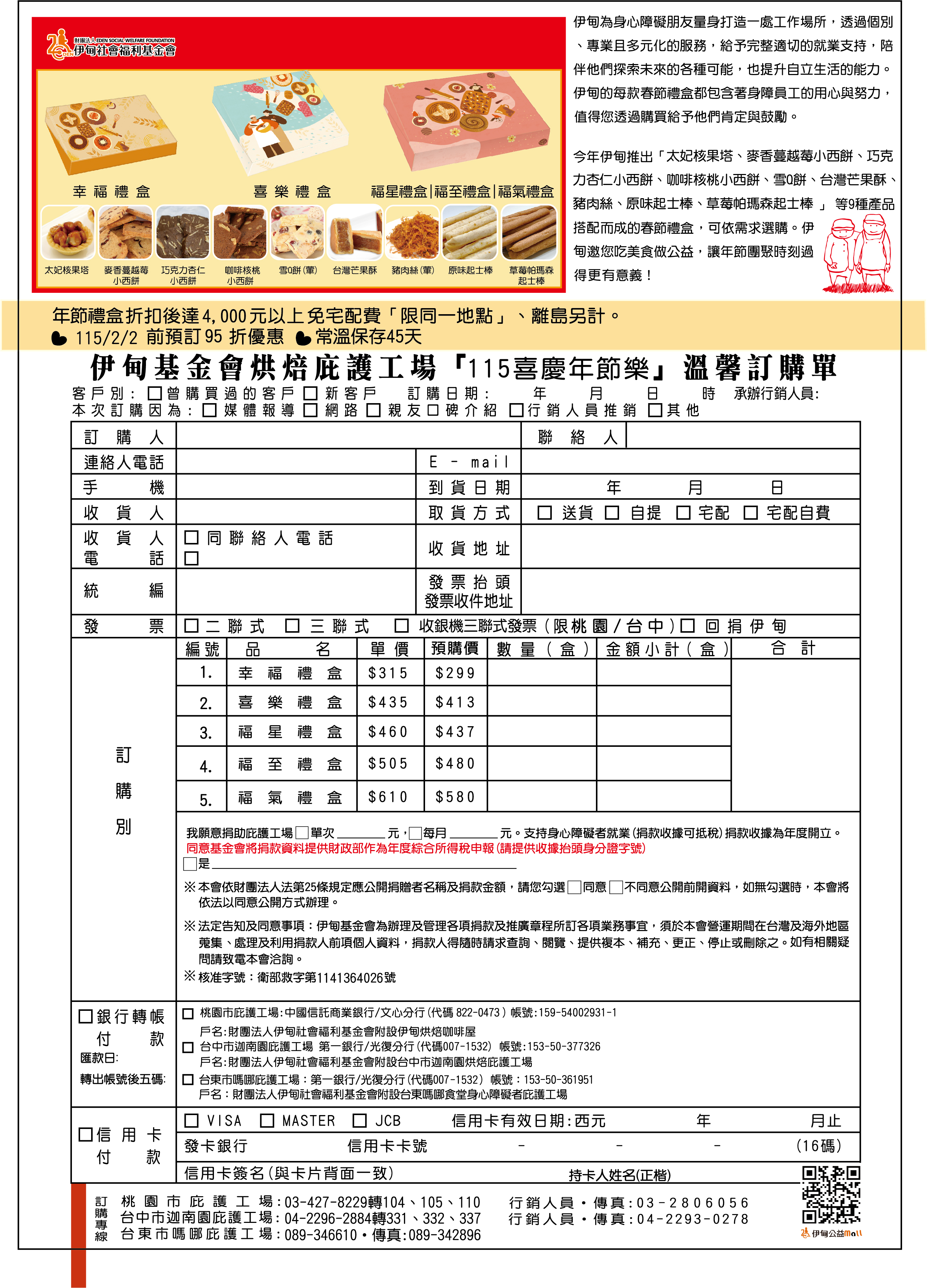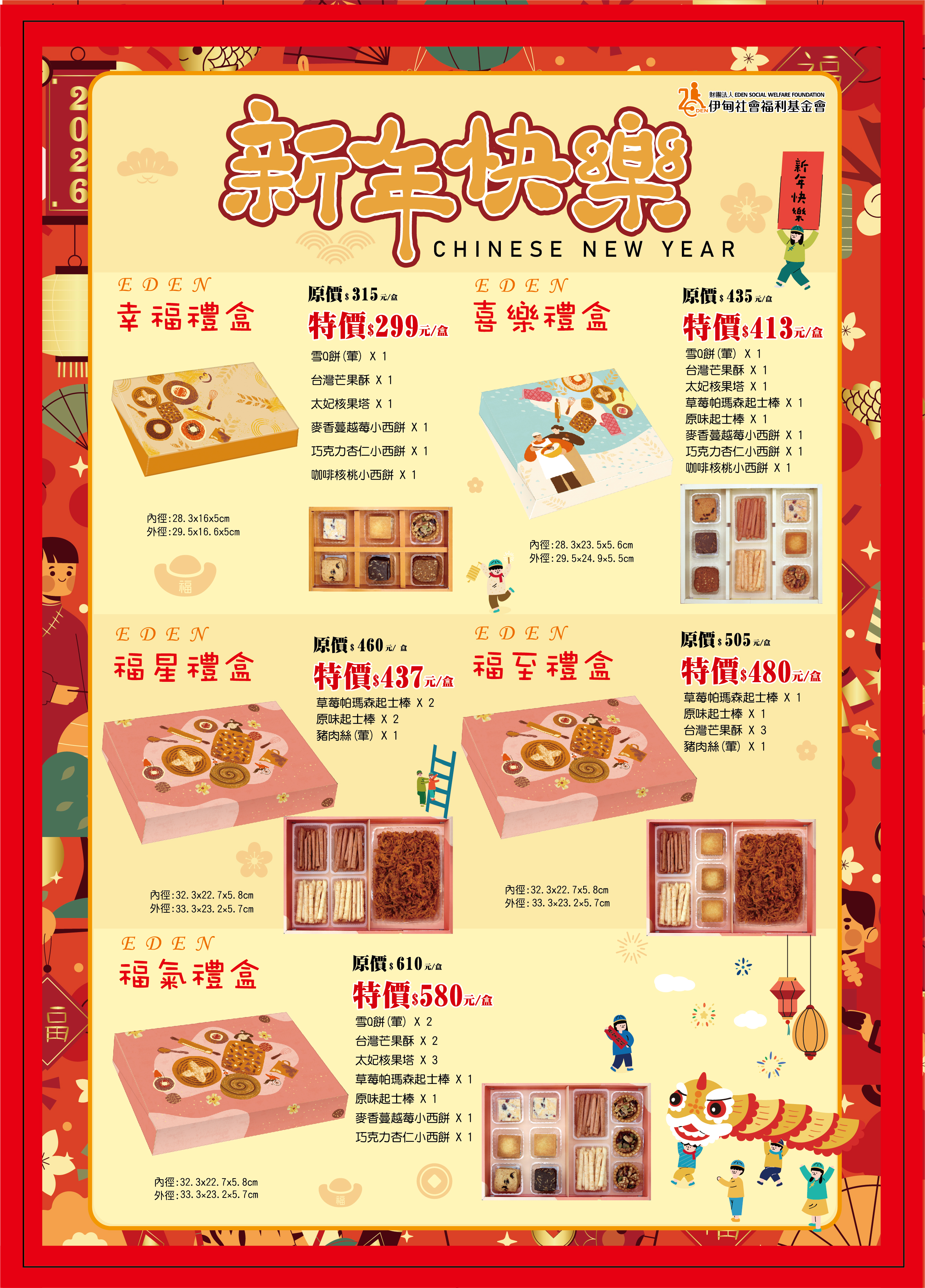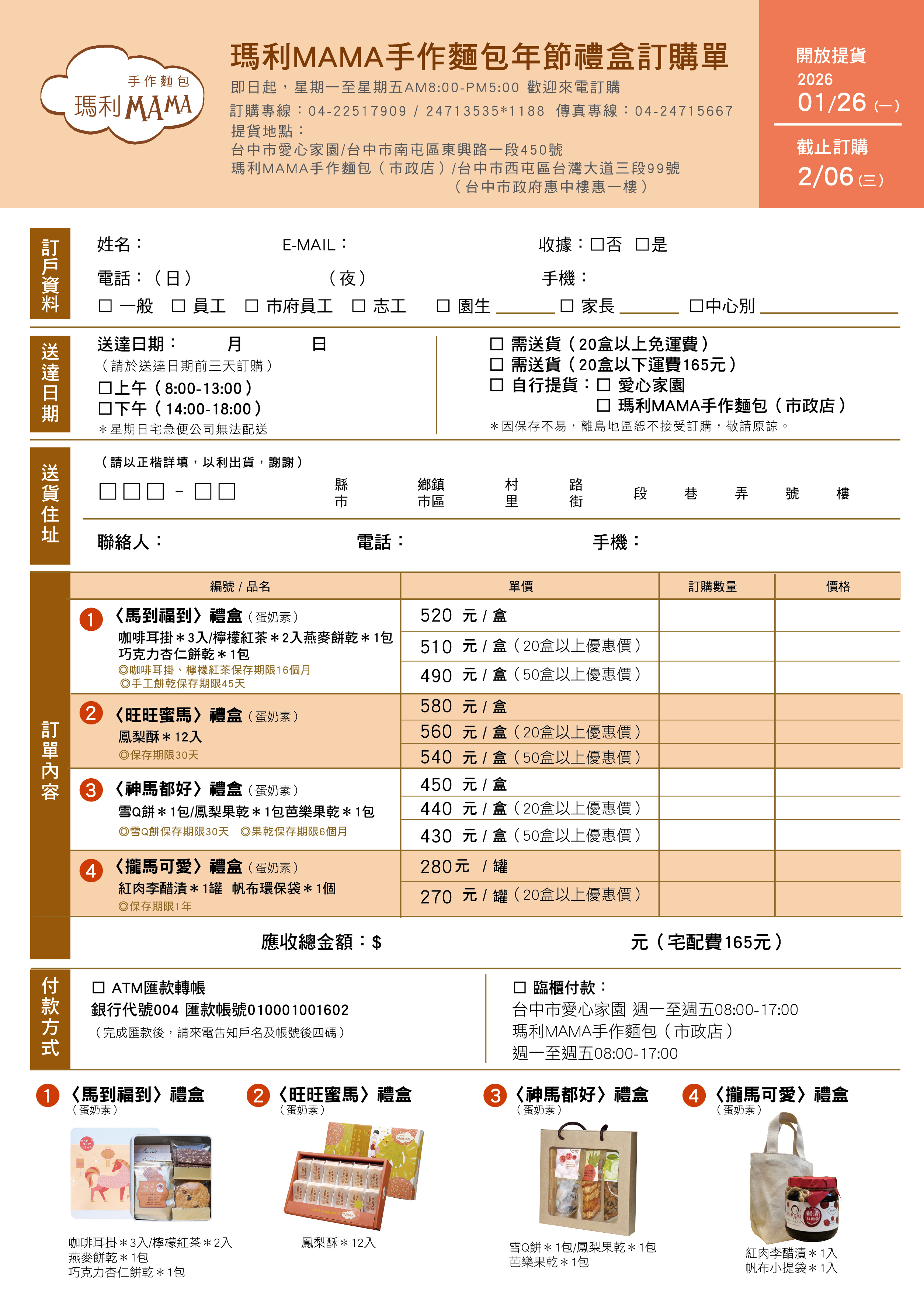 台中市政府勞工局指出,為迎接馬年新春,中市庇護工場推出多款設計精緻的年節禮盒,內容涵蓋手作糕點、餅乾及果乾等多樣化品項。其中,迦南園烘焙庇護工場推出『幸福、喜樂、福星、福至、福氣』5款系列,提供9種口味的豐富組合;瑪利MAMA・手作麵包則嚴選4款春節禮盒,集結各式特色手作商品。每款禮盒皆經用心設計,傳遞新年萬物復甦,萬事皆如意的祝福喜悅,所有的商品,都有庇護員工的參與和用心,不論是企業獎勵、或是家人朋友間的心意,都是最佳選擇,展現誠摯心意並肯定其努力成果。