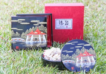 「湖心亭漆藝餅盒」由豐原業者製作,盒蓋以黑色為底漆,塗工工序繁雜,再以手工繪製坐落於台中公園的台中市地標,同時也是台中市政府府徽意象的「湖心亭」,畫工十分精美,不僅是代表台中在地產業、文化的藝術品,更具有收納餅乾、糖果的實用價值。