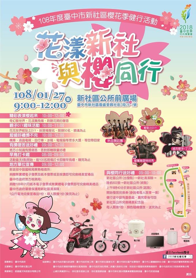 2019新社櫻花季將於1月27日(星期日)當天上午9時至12時,在新社區公所廣場及周邊道路展開,除可欣賞山櫻美景,還結合賞櫻健行活動送精美禮品(數量有限,送完為止),現場節目更有歡樂小丑魔術秀、魅力四射舞蹈團及城市歌手-丁力熱情演唱!
