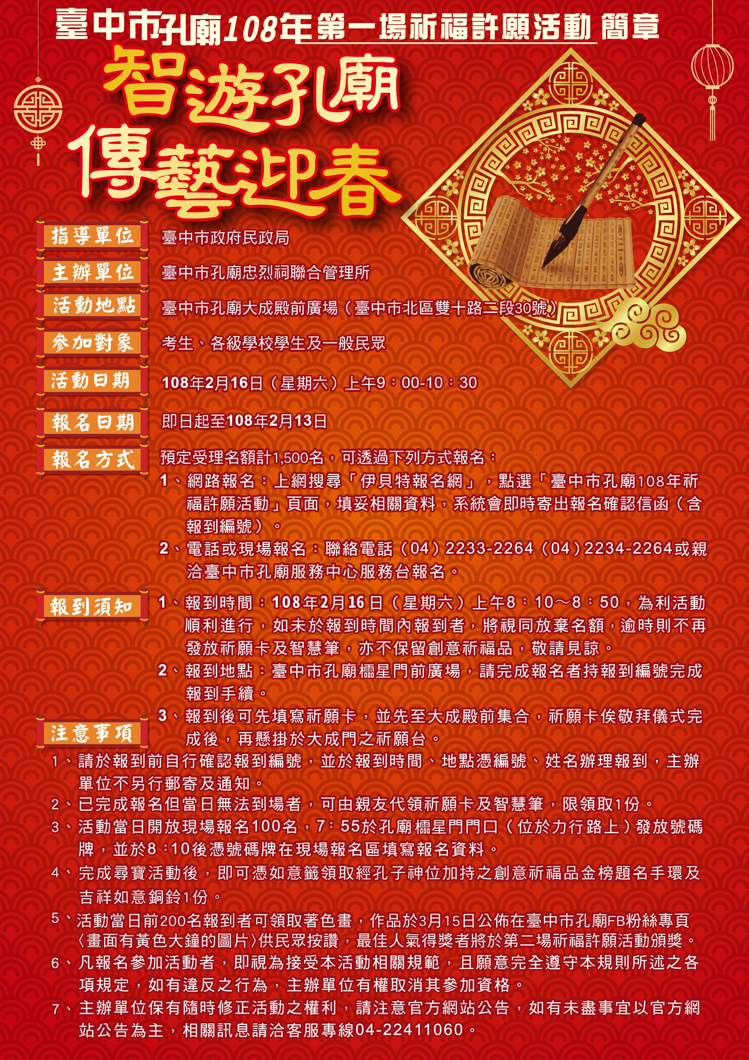 1.台中市孔廟108年第一場祈福許願活動即日起開放報名,歡迎考生及民眾踴躍報名參加!