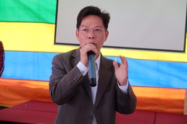 準社會局長李允傑在圍爐活動現場,與一位因音樂而重拾自信的園生合唱「雪中紅」。他表示,這位園生因疾病的關係,自幼在學習方面較一般的孩子困難,透過希望家園老師們的協助,開始接觸音樂並在比賽中重拾自信,肯定園生的成長與感謝教師投注心力陪伴。