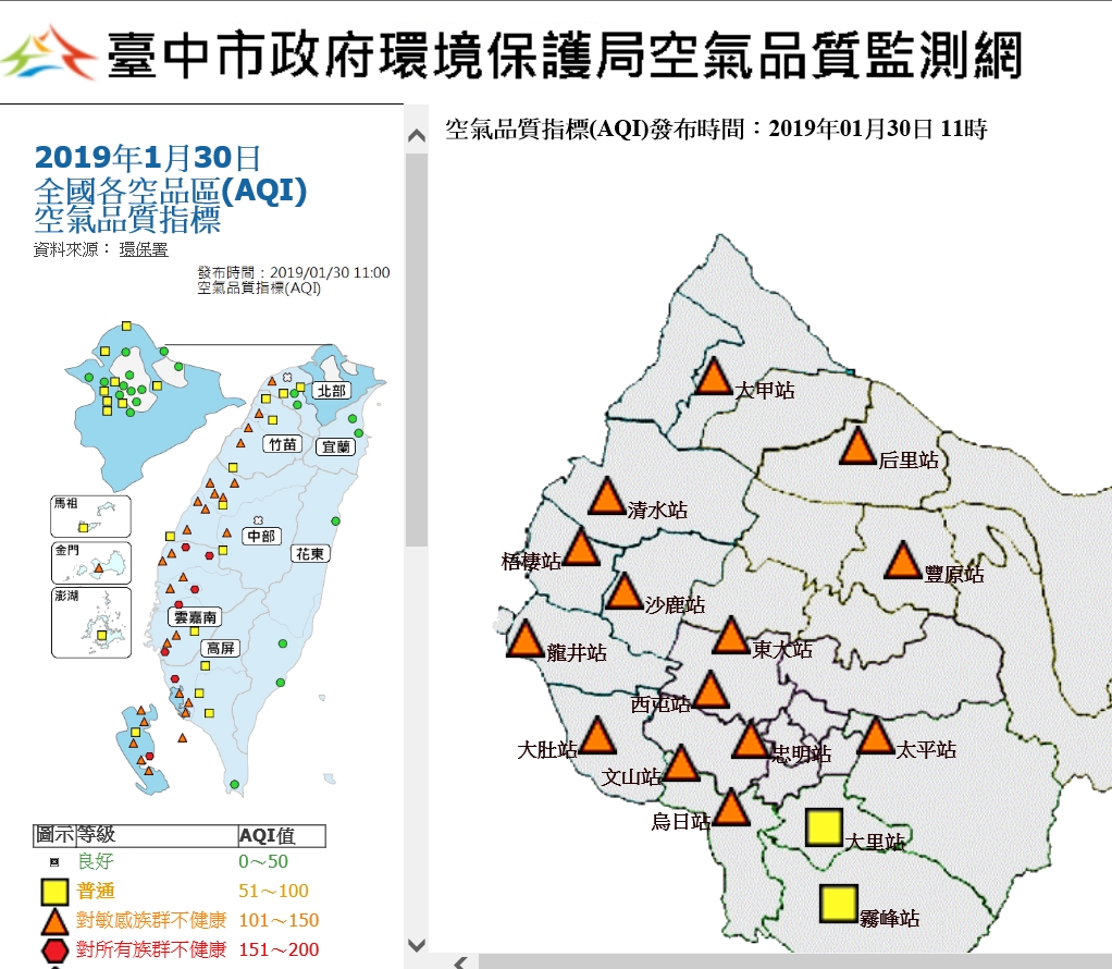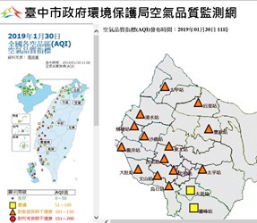 受高壓迴流吹東南風影響,台灣西半部地區因位於背風側,風速偏弱導致擴散條件較差,汙染物持續累積影響空氣品質,雲嘉南、高屏地區多數測站AQI指標已達橘色至紅色等級,台中市上午11時,包括西屯、忠明、豐原、文山、大甲、后里、大肚、東大附小、清水、龍井等測站AQI也達橘色等級,指標污染物為細懸浮微粒,市府已啟動二級防制應變,預計今明二天空品可能持續不佳,提醒民眾注意防護措施。