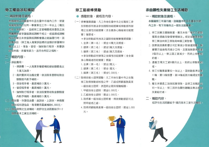 吳局長指出,「勞工權益基金」是對戶籍地與工作地均在台中市的勞工,因職業災害而致生活困難,提供失能、住院慰助金、子女獎學金、職業災害期間協助、子女就學補助等;並針對因勞資爭議涉訟勞工,提供勞工權益涉訟補助,以及特殊作業勞工、高工時從業人員及中高齡以上勞工健檢補助,落實台中市政府照顧勞工的美意。