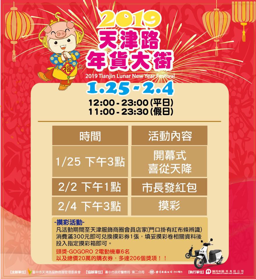此外,台中最大規模年貨大街「2019天津路年貨大街」於1月25日至2月4日共舉辦11天,22日下午1點市長盧秀燕將在天津年貨大街活動,發送1688份開運紅包,祝福大家發大財。詳細活動內容,可至「天津路服飾商圈」FB粉絲頁(https://www.facebook.com/Tianjinboy/)查詢。