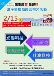 台中市就業服務處於2/15()上午10點至下午130分,在經濟部加工出口區管理處台中分處後棟3樓康樂室(台中市潭子區加工出口區建國路1),舉辦「2019諸事順薪 職運旺」潭子區廠商聯合徵才活動,邀請光聯科技、佳凌科技、伯特光電及矽品精密等4家在地優質廠商設攤徵才,提供182個工作機會,年後求職就順薪~歡迎把握機會踴躍參加。詳洽04-25346908潭子就業服務台。