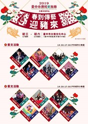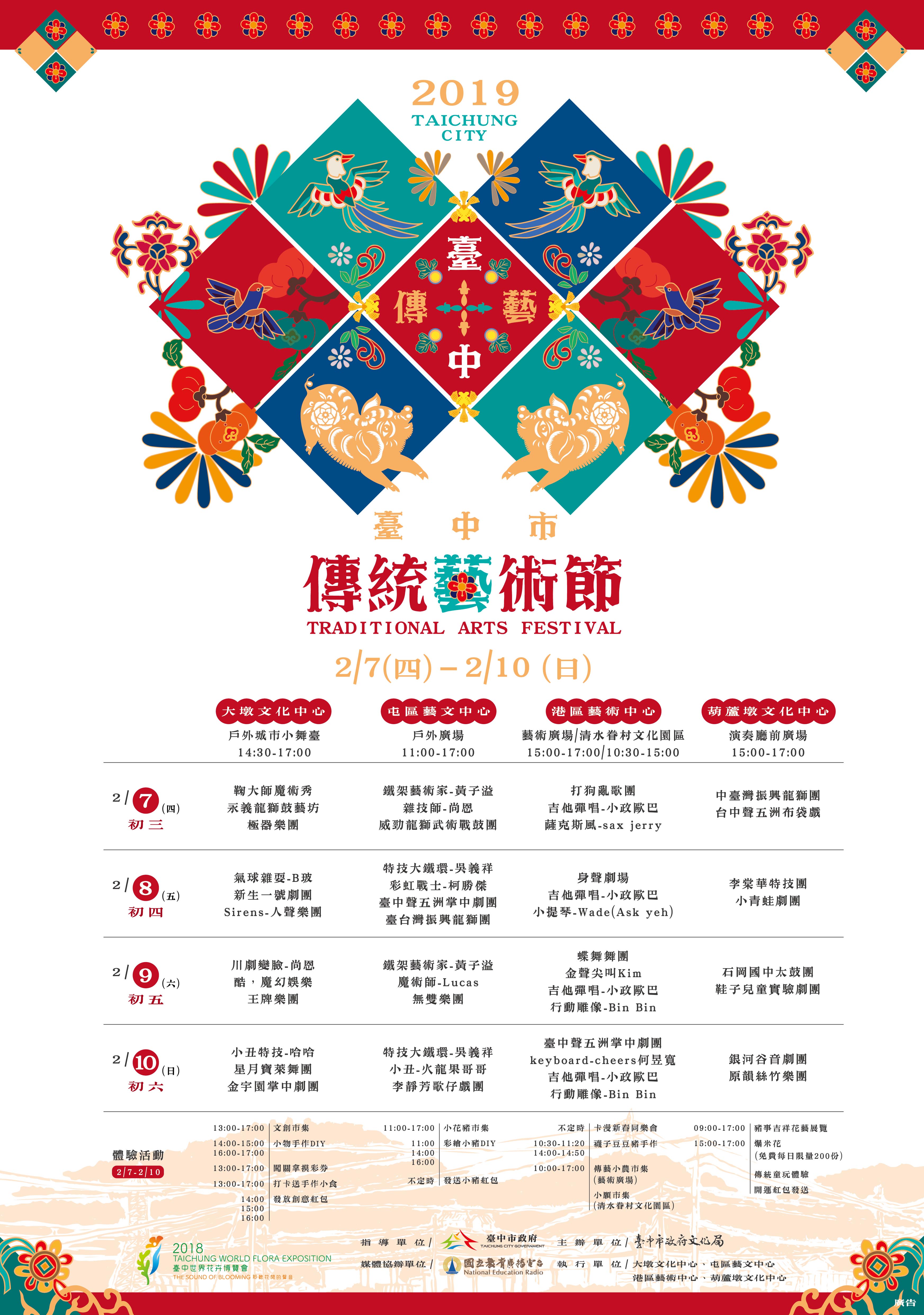 初三到初六(2/7-2/10)2019台中市傳統藝術節將在大墩、葫蘆墩、港區和屯區等四大文化中心,帶來龍獅、音樂、舞蹈、戲曲等精采演出,還有市集和手作,限量紅包送給您,讓您過好年、沾喜氣!