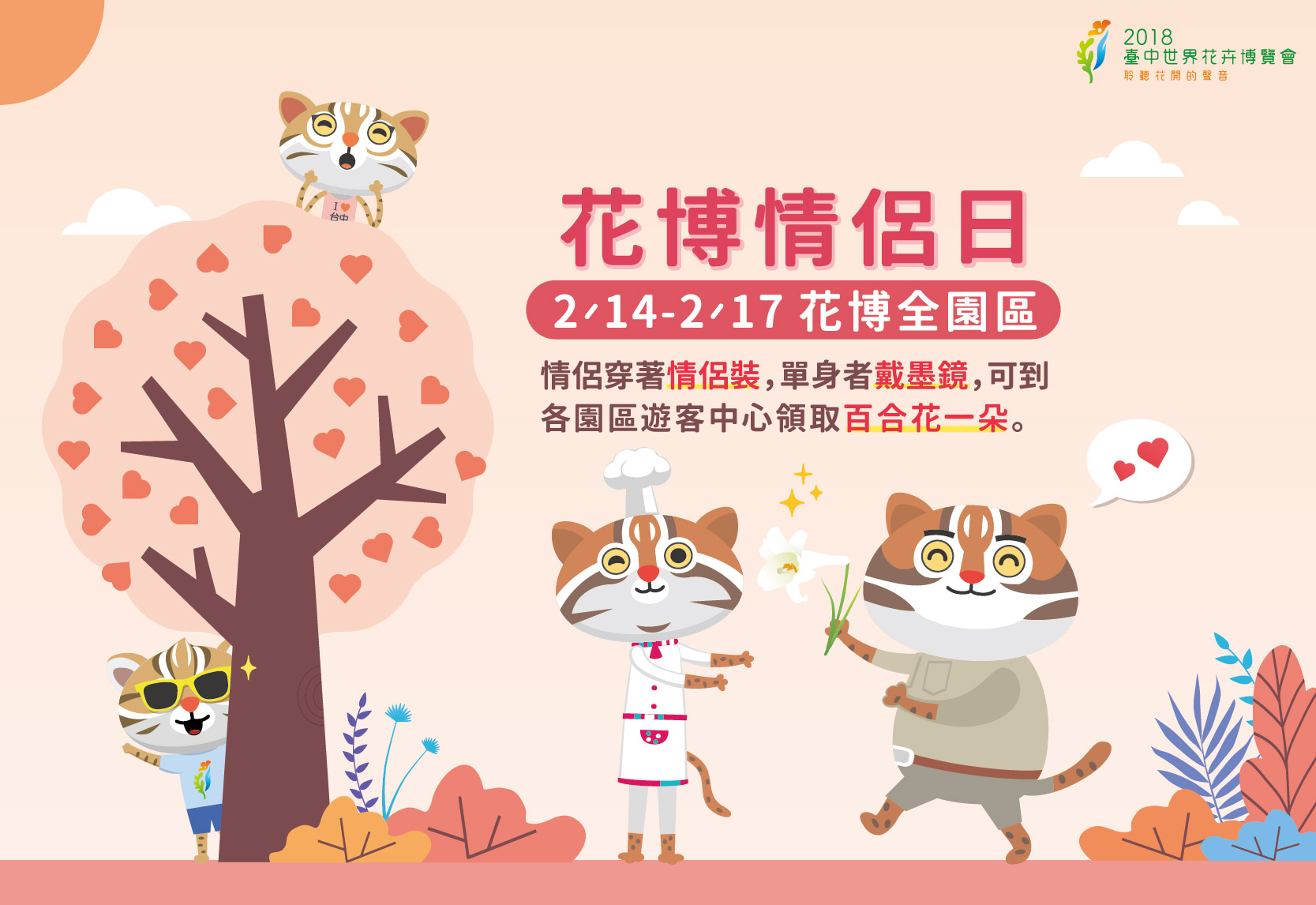 明天就是一年一度的情人節,台中花博后里、外埔及豐原園區將舉辦應景的「情侶日」活動,更主打「單身被閃沒關係!照樣可以拿好禮!」,要讓所有民眾都能開心度過情人節!市府新聞局表示,214日至217日來逛花博,情侶穿著情侶裝、單身者戴墨鏡,就可以到各園區的遊客中心領取1朵百合花,每園區每日限量600朵,廣邀民眾踴躍到花博走走!