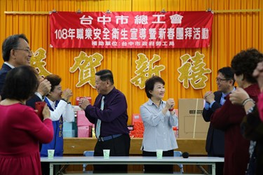 台中市總工會今(13)日舉辦「108年度職業安全衛生宣導暨新春團拜」,市長盧秀燕與勞工局長吳威志到場祝賀。盧市長表示,她當選就是要服務市民,未來將全力以赴拼經濟,改善勞工環境、保障勞工權益與福利。未來市府和總工會也會攜手同心,積極為勞工服務。