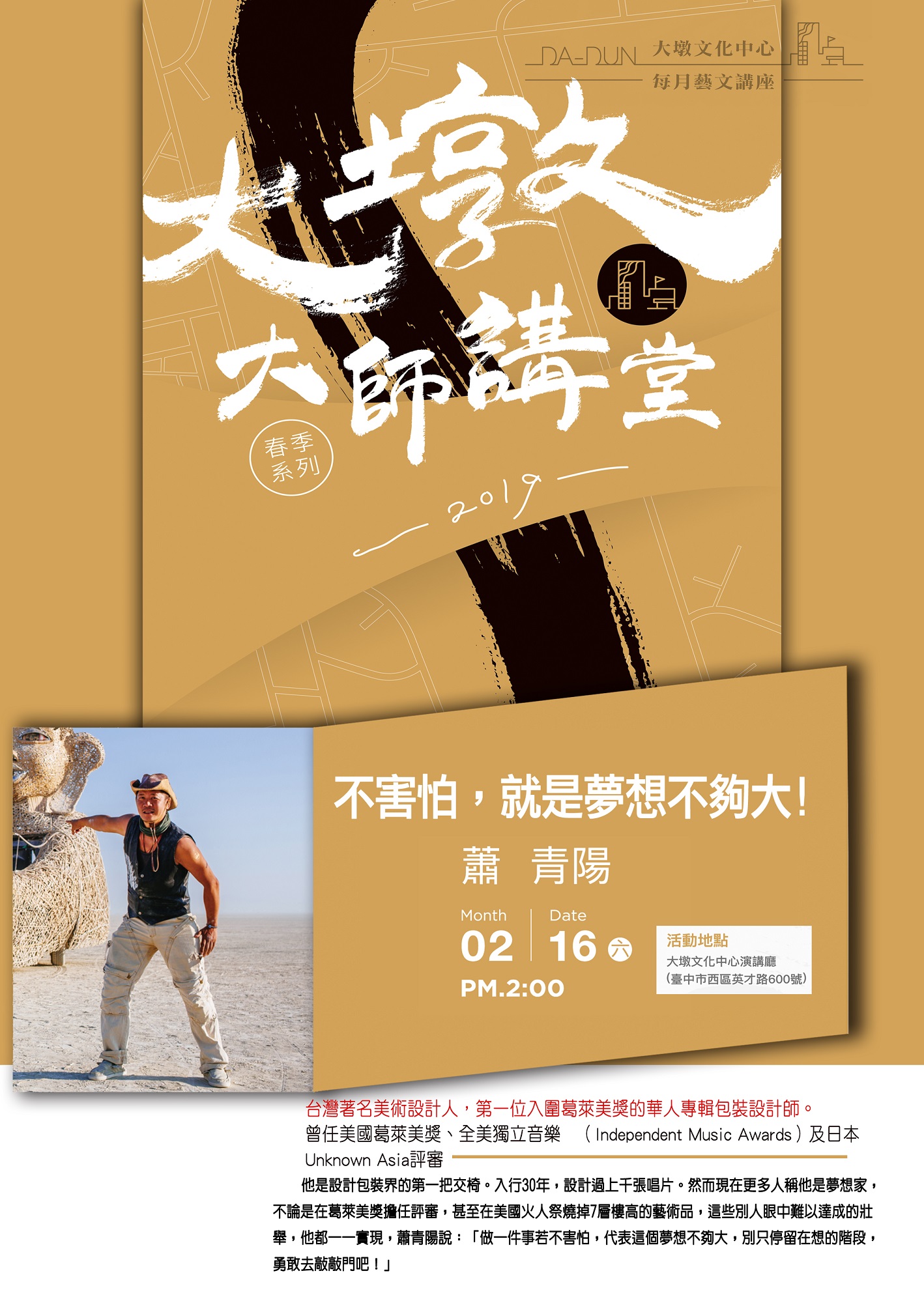 2月16日14時至16時在大墩文化中心演講廳,邀請蕭青陽主講 「不害怕,就是夢想不夠大」,活動免費入場,邀請大家踴躍參與!本週還有不少展覽、演講等活動,更多資訊,請見「中市週末活動看板0216_0217」。(2/15*6)*新聞局