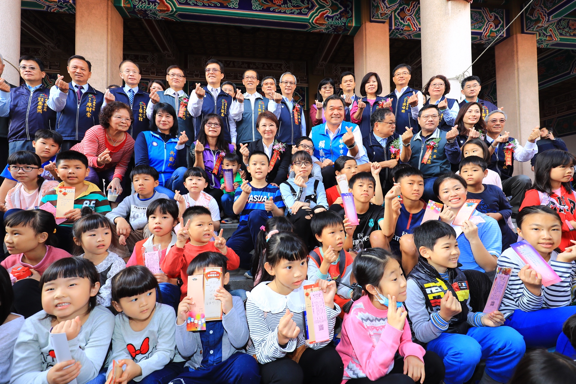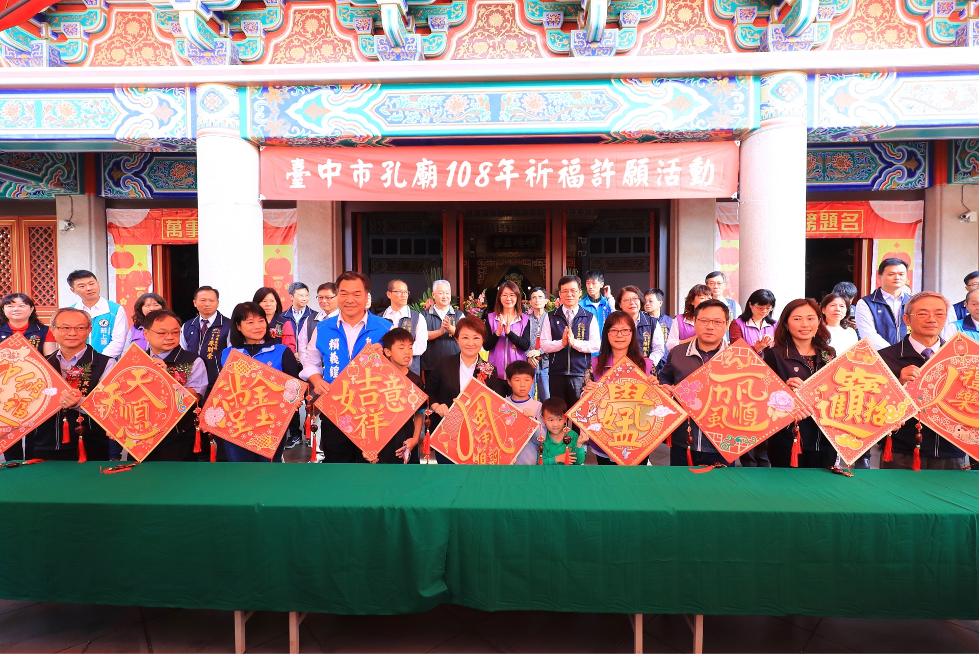 台中市孔廟今(16)日舉辦今年首場祈福許願活動,結合元宵節以「智遊孔廟 傳藝迎春」為主題,由市長盧秀燕擔任主祭官,在大成殿廣場帶領 1500名學子依古禮上香許願,並結合創意尋寶遊戲探索孔廟,安排古代讀書人為民眾解籤,完成任務後可領取孔子加持Q版金福豬祈福手環,搭配紅色金榜題名手環,期許考生金榜題名、學業進步。