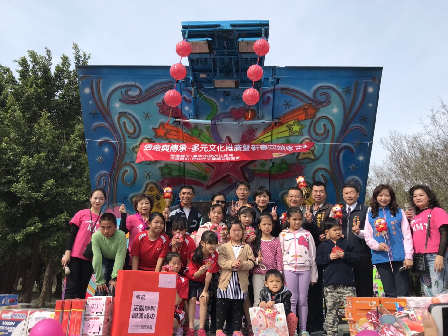 社團法人台中市艾馨婦女協進會今(17)日在大肚運動公園,舉辦「信念與傳承-多元文化推廣暨新春回娘家」活動,200多位新住民及民眾踴躍參與,除安排趣味競賽及精彩表演節目外,並設有印尼歌謠、越南小吃、中國節慶及台灣手工藝春仔花等多元文化攤位體驗,期望藉此增進新住民彼此情誼,也展現台灣社會尊重、包容的多元文化面貌。副市長楊瓊瓔也到場分送飛天豬小提燈,祝福大家新的一年諸事順利。