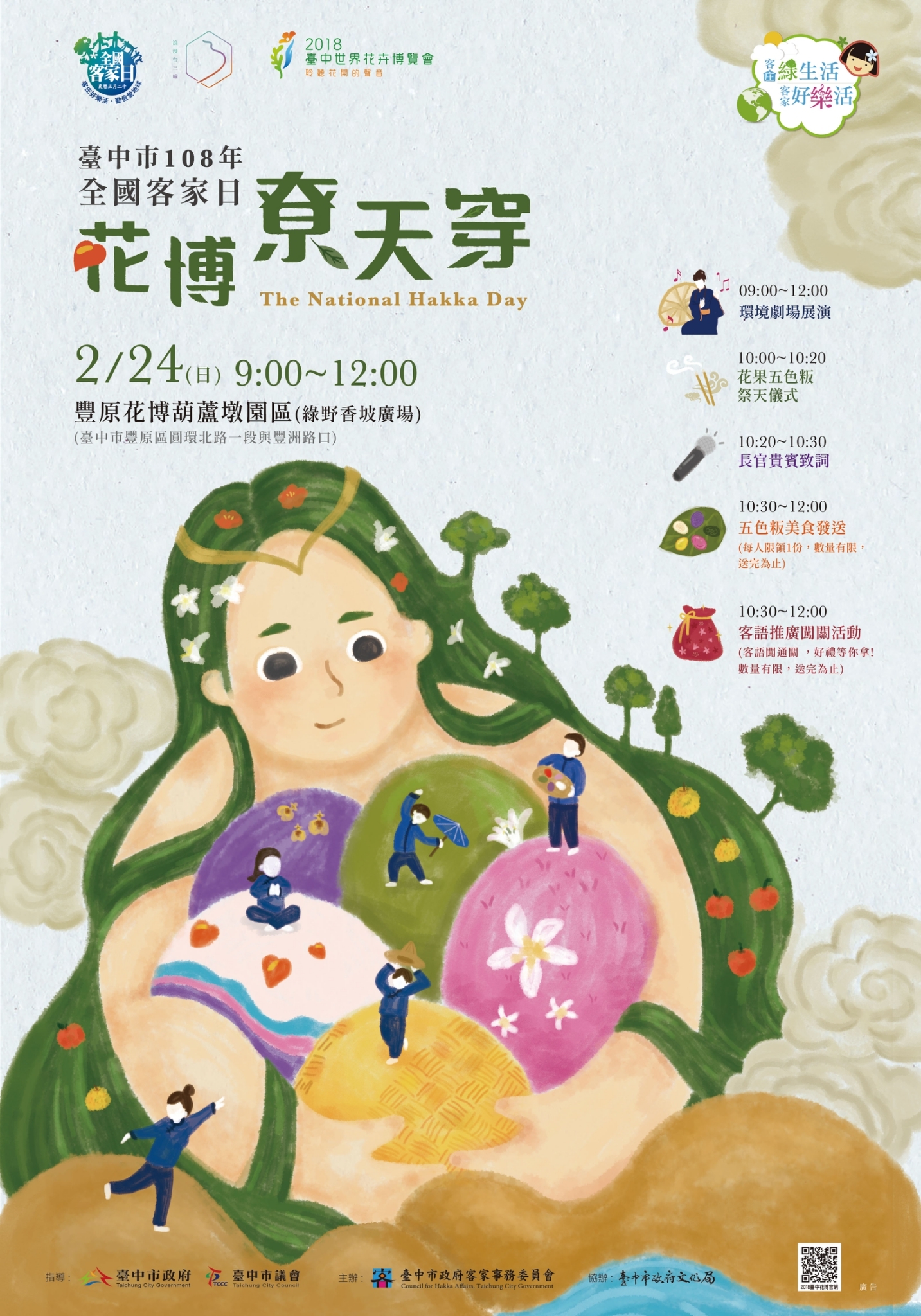「台中市108年全國客家日」活動將於年2月24日上午9時至12時在豐原花博葫蘆墩園區舉辦,活動安排「花果五色粄祭天儀式」、「環境劇場展演」及「客語推廣闖關活動」等精彩節目。