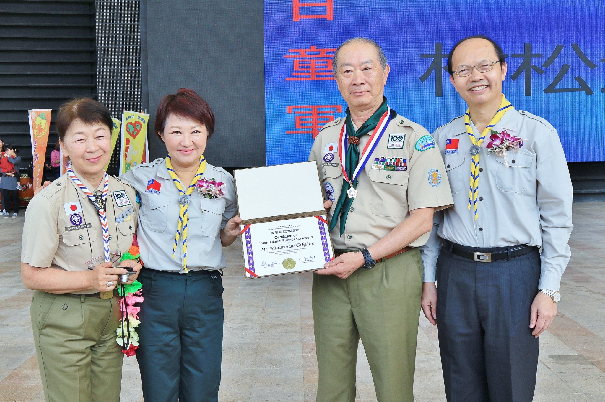 今日慶祝大會由明道中學、仁美國小、嶺東中學及信義國小帶來熱鬧開場,盧市長、市議員陳政顯、張耀中、劉士州、教育局長楊振昇均到場共襄盛舉,日本童軍靜岡縣聯盟理事長村松武博也率團來台參加,並由盧市長頒贈聯盟國際友誼章,日本靜岡縣童軍長青會長鈴木邦夫也回贈市府友誼牌座,盼未來有更多交流。