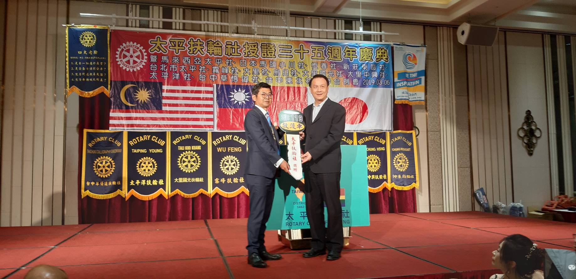 消防救護車及急救器材裝備捐贈典禮中,太平扶輪社長郭宜書代表捐贈,消防局專門委員施文杰代表受贈。