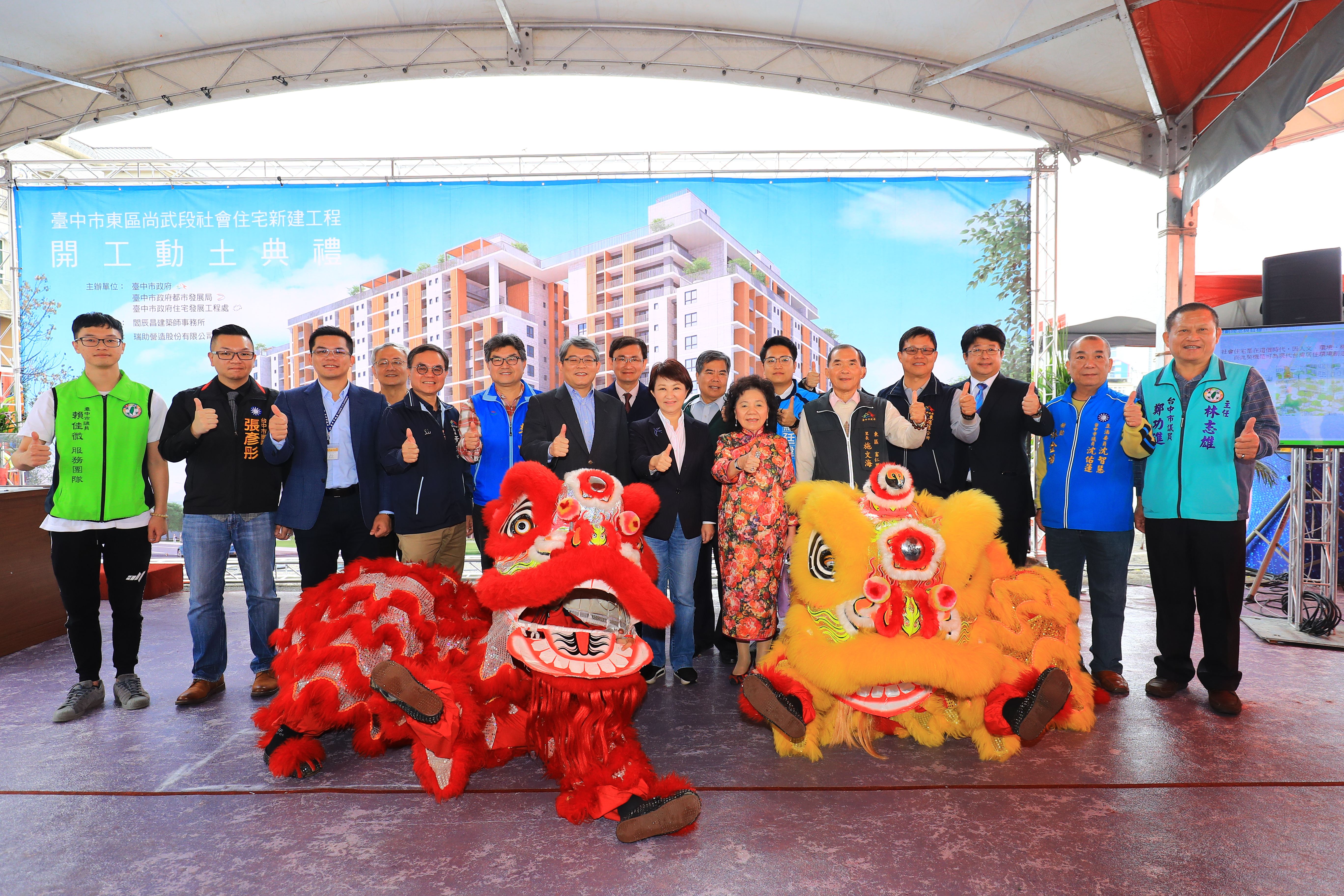 台中市社會住宅已完成豐原安康段第一期,大里區光正段第一期也預計於今年5月入住,台中市政府持續建設友善共好社宅社區,今(10)日舉行「東區尚武段」動土典禮,提供802戶住宅單元,是台中市首座社會住宅百分之百融資興建典範,減輕市府財政負擔。市長盧秀燕表示,台中市社會住宅未來將在市府與內政部通力合作下將加速進行,打造社會住宅成為地區的指標「landmark」,達到人口引入的效果,活化區域經濟,帶動地方繁榮。