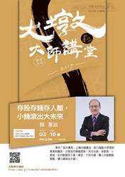 「大墩大師講堂」3月16日下午2時,在大墩文化中心邀請有「股市憲哥」之稱的賴憲政,主講「存股存錢存人脈,小錢滾出大未來」,從現今經濟趨勢分析、科技應用的改變,分享理財投資概念、如何建立理財習慣及今年投資策略。欲參加的民眾可至大墩文化中心網站(http://bit.ly/2HhEk0m)免費報名。