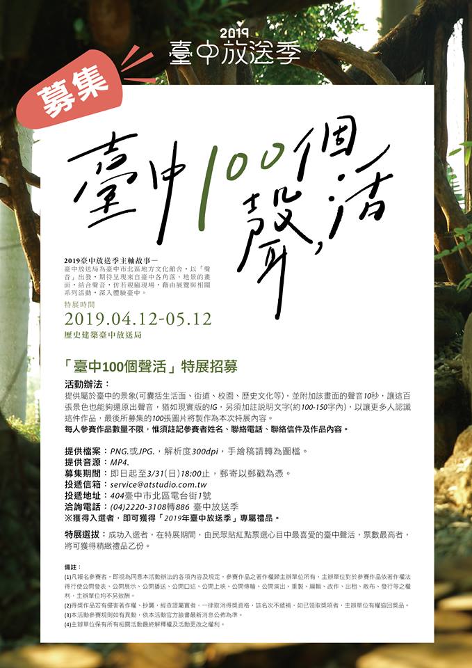 1.「台中100個聲活」即日至3/31止,創作招募開跑!