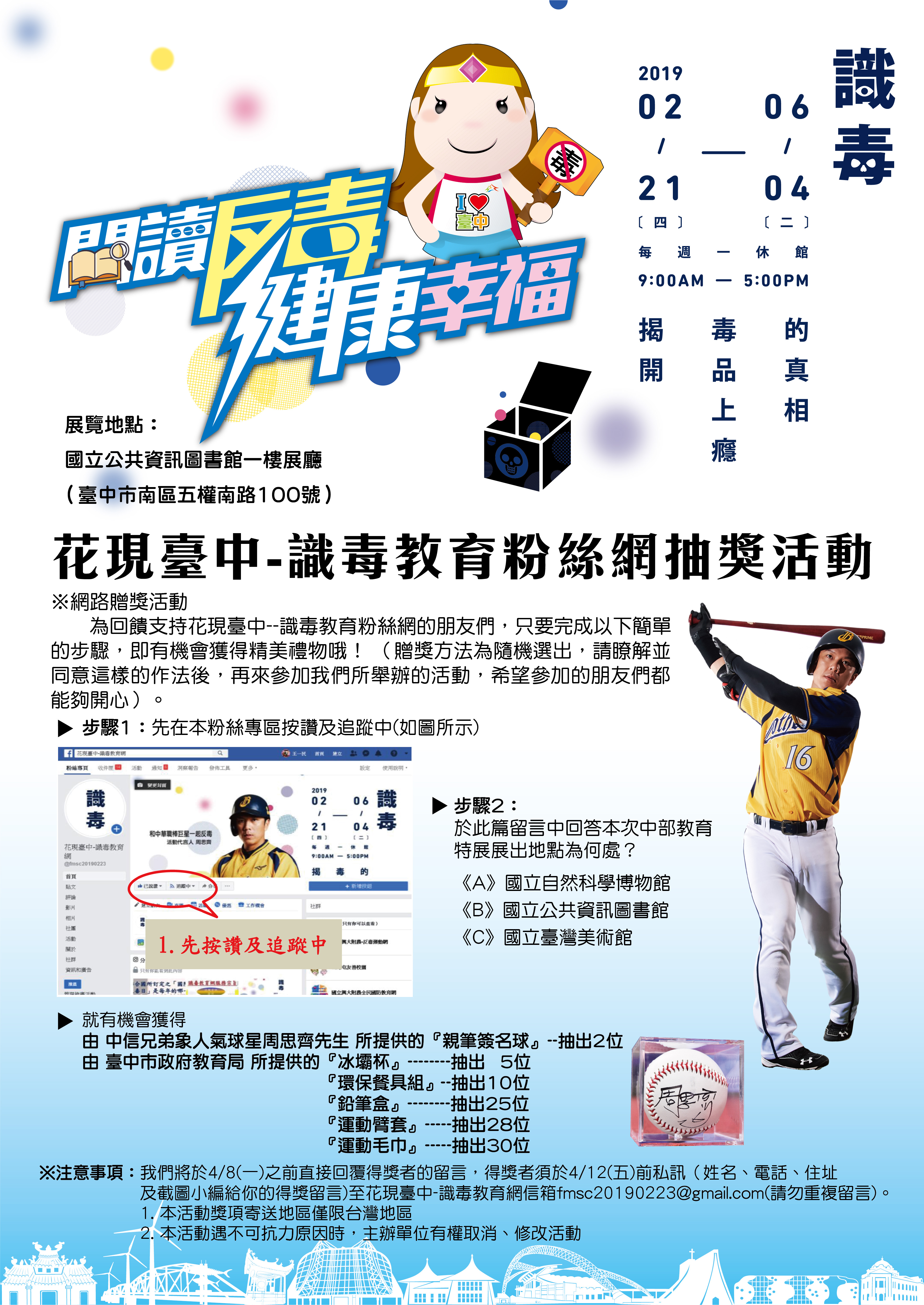 「識毒—揭開毒品上癮的真相」反毒教育特展,即日起至6月4日在國立公共資訊圖書館展出,透過科技體驗、心靈感受、提供個案生命歷程等方式,希望讓大家從識毒、知毒而反毒。而活動期間只要上花現台中-識毒教育網FB粉絲專頁(http://bit.ly/2TOBNk0)按讚並追蹤,就機會拿到中信兄弟周思齊簽名球及精美獎品喔!本週還有不少展覽、演講等活動,更多資訊,請見「中市週末活動看板0316_0317」。(3/15*6)*新聞局