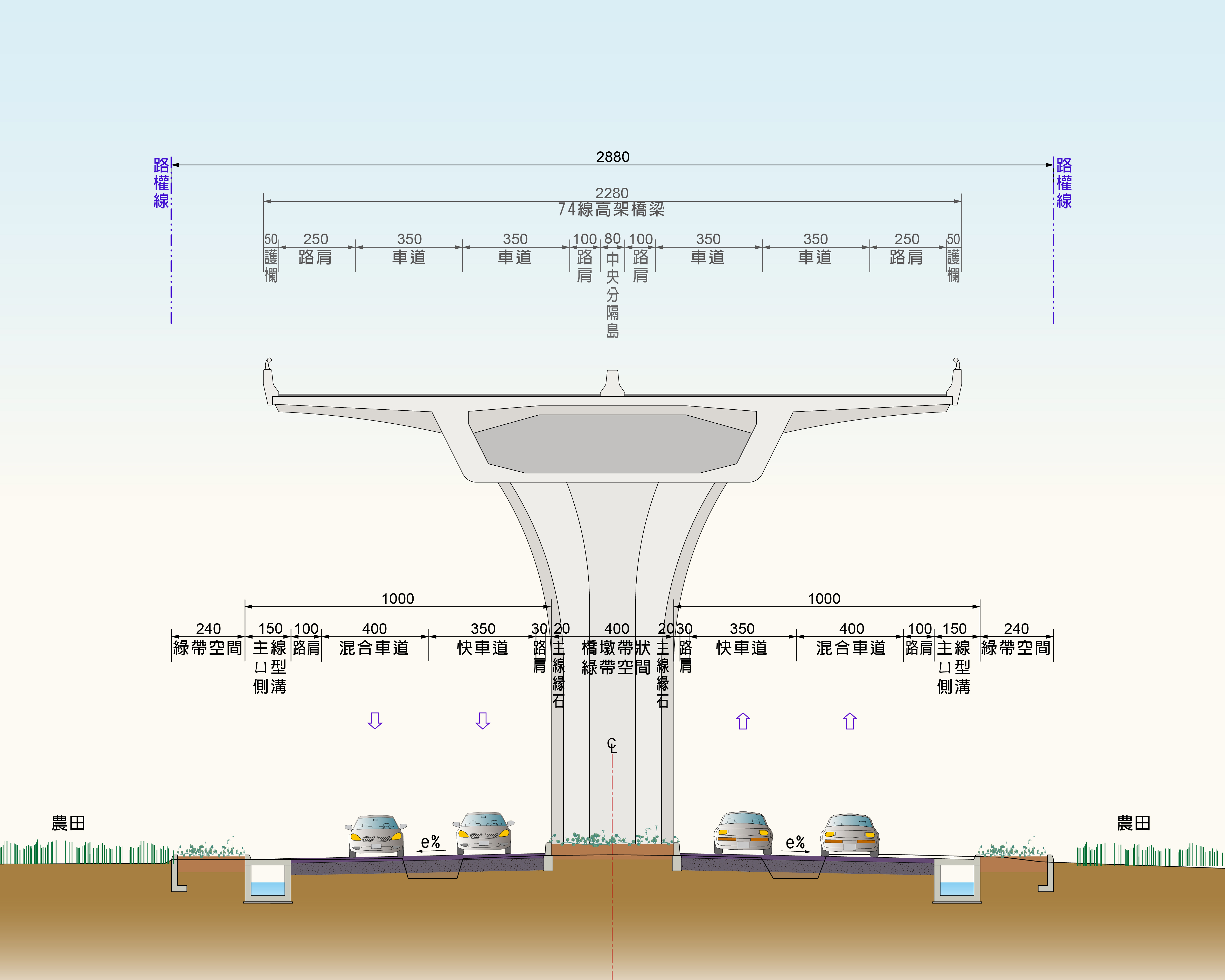 建設局指出,大里—霧峰台74高架橋下平面道路闢建工程規劃分二期辦理,第一期配合匝道增設工程及中山路延伸工程,將先闢建大里區路段,由草堤路至草溪西路間的橋下平面道路,總經費約11億4,086萬5,000元,其中工程款10億4,086萬5,000元,用地費1億元。