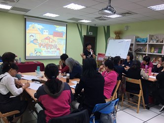 研習會邀請台灣性別平等教育協會講師莊淑靜,帶領志工利用桌遊牌卡融入性別、族群等多元議題,讓志工瞭解如何帶領民眾認識家庭類型、如何培養民眾同理心,並積極破除傳統刻板家庭印象。