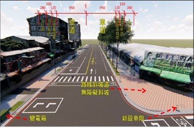 在人行道規劃上,除了以無障礙設計,更以「會呼吸」的人行道為主軸,採用「管式混凝土結構」及「排水礫石樁」工法,讓水與空氣穿過透水鋪面,藉由大氣中涵養的水分調節溫度,減緩熱島效應;另一方面,也能避免瞬間暴雨造成排流不及、回灌或淹水情形,減輕排水系統負擔,增加人行道的承載能力向下逕流至地下水補注。