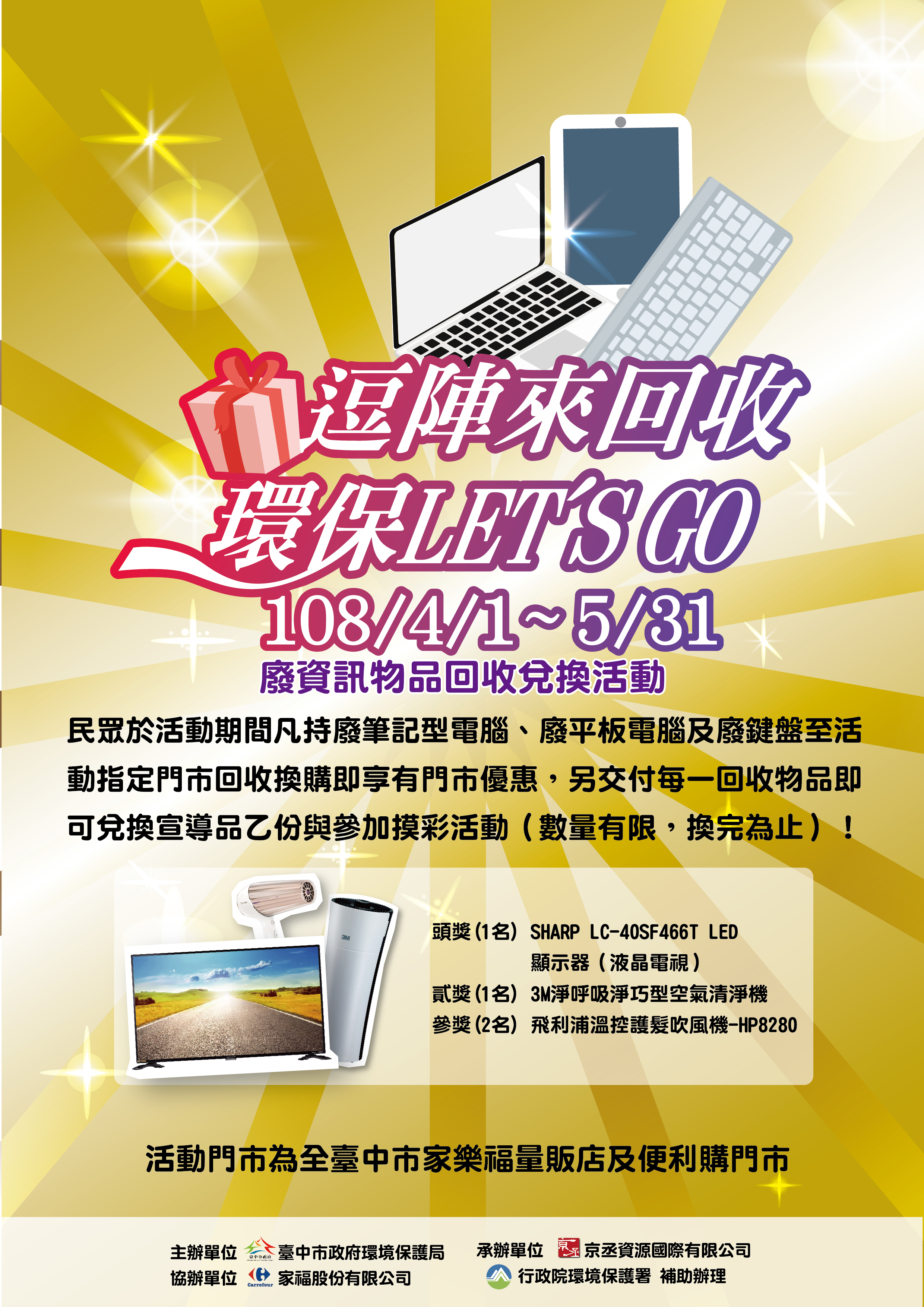 為減少廢棄3C產品遭任意棄置,台中市政府環保局聯手家樂福9家量販店及12家便利購門市,共同舉辦「逗陣來回收」廢資訊物品回收活動,自4月1日起至5月31日止,民眾只要持廢筆電、平板電腦或廢鍵盤至指定地點,除享有購機最高500元現金折扣,更可參加摸彩活動抽大獎,歡迎踴躍參與。