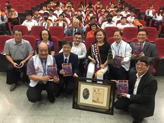 口足畫家高淑專為青年高中校友,今日特地回到母校分享《媽媽嫁妝》繪本內容,教育局副局長劉火欽與周大觀基金會創辦人周進華也出席,並共同頒發全球熱愛生命獎章,肯定高淑專用母愛戰勝癱瘓、傳愛世界。