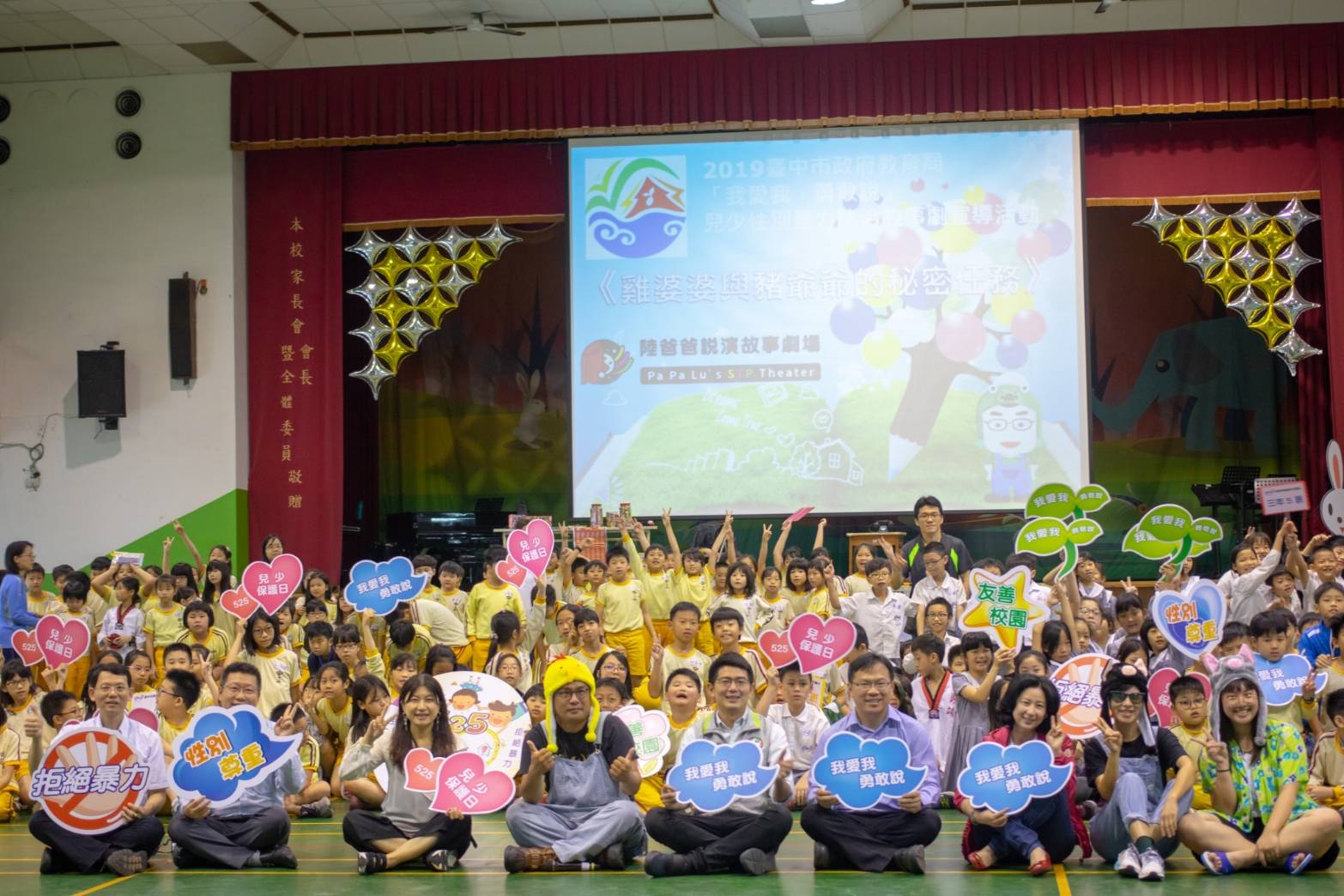 教育局表示,市府推廣「525,我愛我,勇敢說」台中市兒少保護系列活動,今年規劃校園巡迴宣導,以故事劇方式呈現「性別尊重」、「自我保護」、「友善校園」、「拒絕暴力」等主題,設計「雞婆婆與豬爺爺的秘密任務」原創故事。