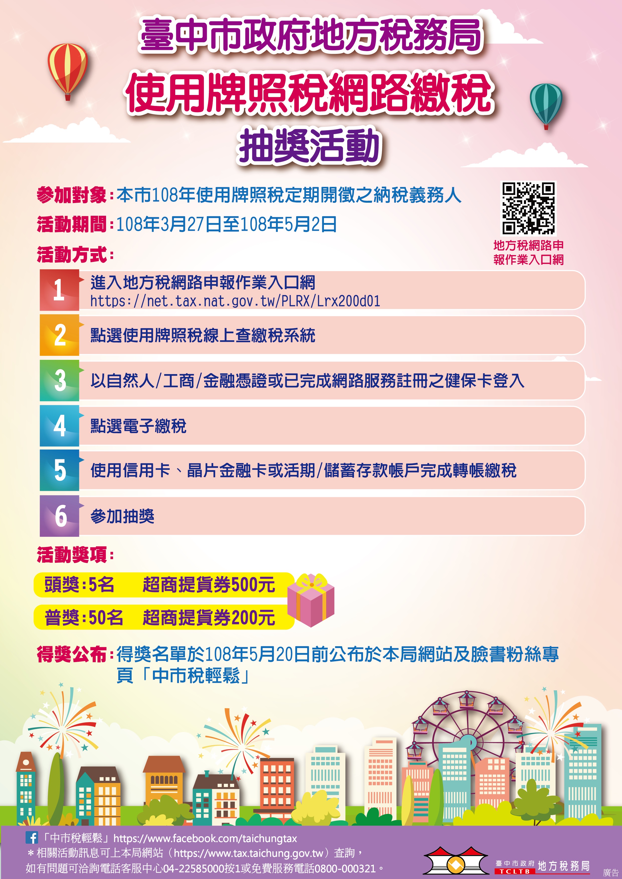 今年使用牌照稅從今(1)日起開徵,台中市政府地方稅務局表示,納稅義務人只要在5月2日前利用自然人憑證、工商憑證、金融憑證或已完成網路服務註冊的健保卡,至「使用牌照稅線上查繳稅系統」,使用信用卡、活期(儲蓄)存款帳戶或晶片金融卡完成繳稅,即獲得抽獎機會,獎項有500元超商提貨券5名、200元超商提貨券50名,歡迎踴躍參加。