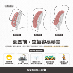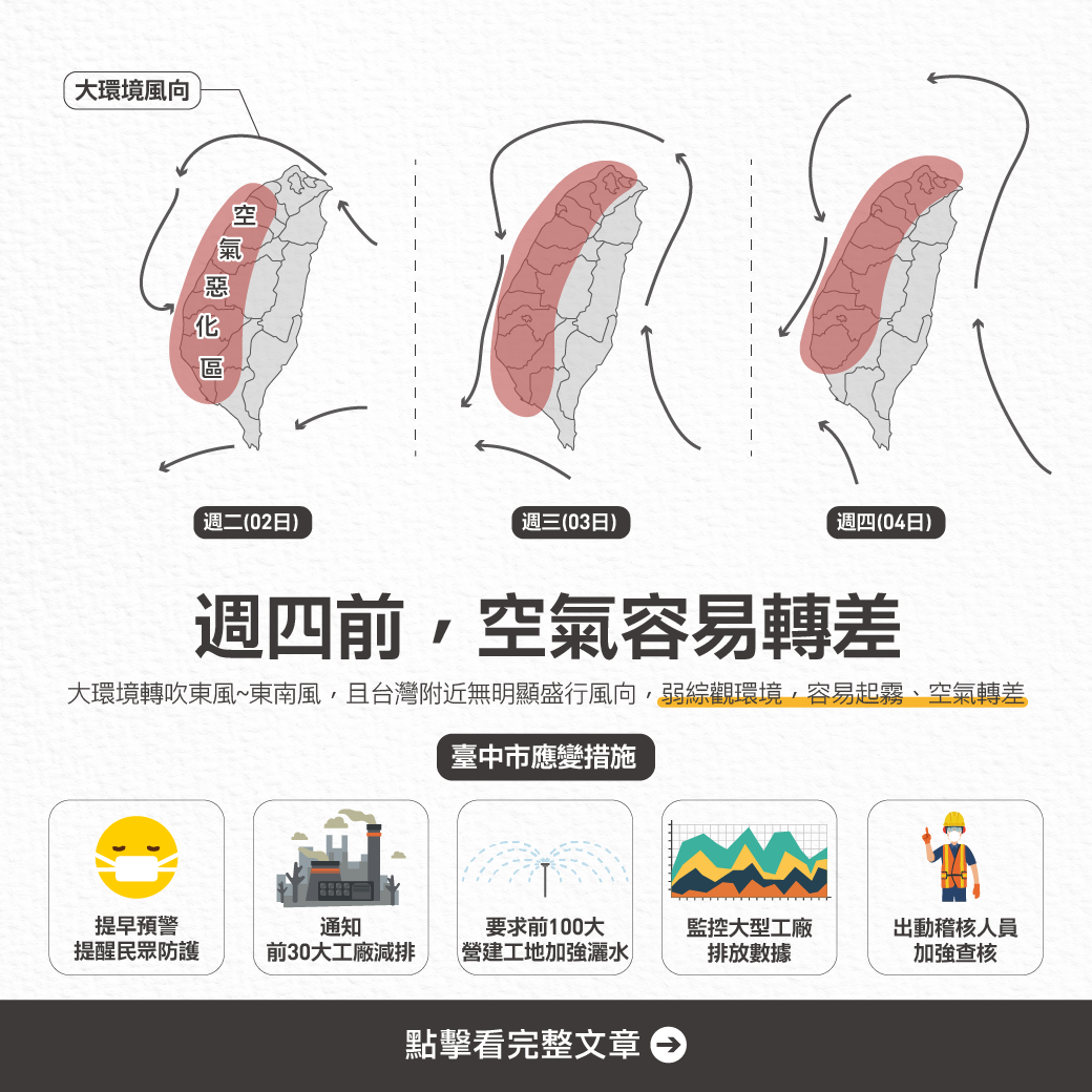 依據行政院環保署空品資訊,未來三天(4/24/34/4)因風場變化大,轉為偏微弱東南風,台灣西半部地區汙染物易累積,預估空品將變差,多為「橘色提醒(對敏感族群不健康)」等級。台中市政府除提前預警,提醒多加留意防護措施,也加強汙染稽查與降載要求,並持續監控空品狀況,採取必要應變措施。