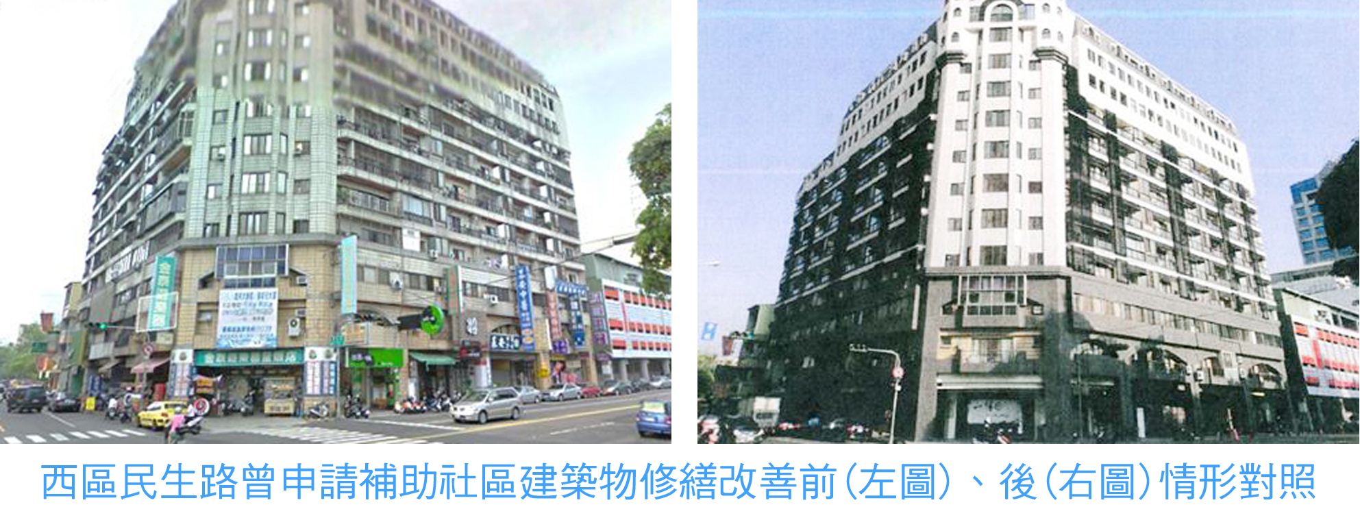 住宅處表示,市府依據「台中市建築風貌及環境景觀改造補助要點」,針對屋齡15年以上老舊建築物的立面修繕、外觀綠美化工程、立面節能減碳或綠能利用設施、建築物機能性修繕及共用設施景觀改造、增設昇降設備等項目受理補助申請。