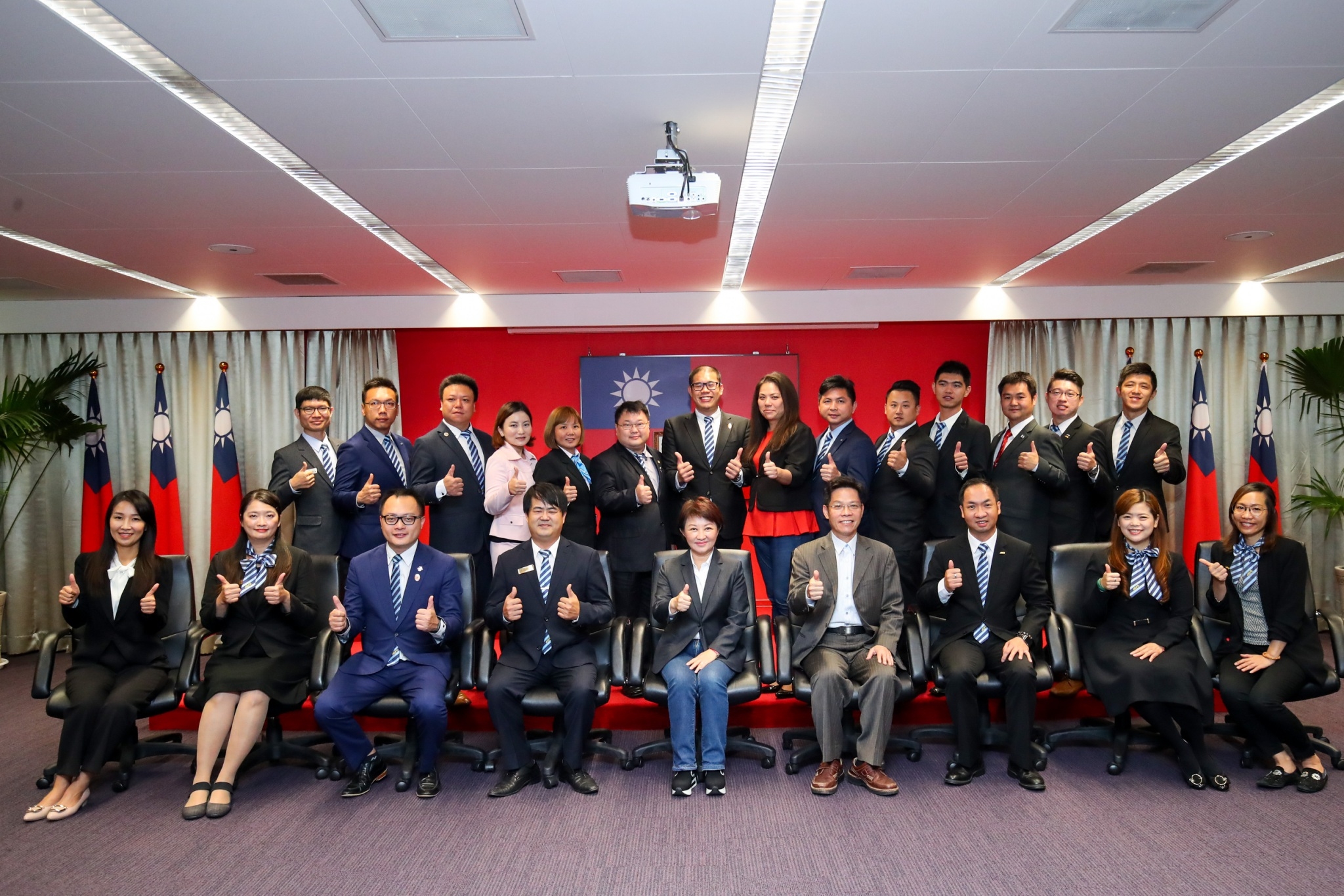 國際青年商會中華民國總會中區會會長陳建弘及台中各分會代表今日拜會台中市政府,市長盧秀燕與市府社會局長李允傑一起迎接表示歡迎。