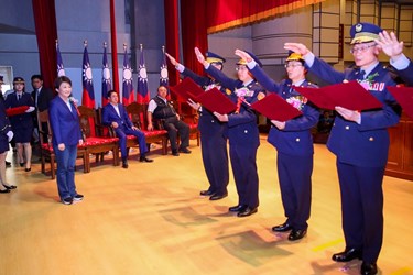 內政部基於推動治安工作需要,通盤檢討調整全國各警察機關警監職務;其中,台中市警察局秘書室主任簡吉照榮陞內政部警政署專委;第三分局分局長陳仕諺、豐原分局分局長林宏儒榮陞警察局警政監,對此,市府也同時針對警察於各分局長及大隊長進行人事調派,聯合布達交接典禮今日在市警局舉行,由盧市長親自主持。