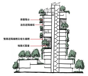 為打造有特色及生態理念的城市發展模式,台中市政府日前發布「台中市鼓勵宜居建築設施設置及回饋辦法」,透過提供免計算容積樓地板或建築物高度等獎勵措施,鼓勵開發商及建築師設計垂直綠化設施、雙層遮陽牆體、植生牆體、複層式露台、鄰里設施等設施。市府都市發展局表示,期盼經由政策引導將綠化植栽引入市民居家空間,同時增進鄰里關係與互動,逐步提升整體居住環境品質,打造台中成為宜居城市。