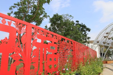 后里馬場園區,除了必到長110公尺、寬70公尺,這座全台最大、符合國際標準規格的馬術競技場,欣賞精湛的馬術表演外,身兼導演及剪紙藝術家的楊士毅,也以「人與自然在一起的幸福時光」為主題,於花舞館戶外打造全台最長240公尺、薄度僅0.2公分的鐵雕剪紙藝術,以紅字為基底色彩,結合新式剪紙創作,以等高線代表大地,樹木、石虎、台灣黑熊等台灣原生動植物圖樣,結合孩子的童言話語,呈現人與自然的美好意象。