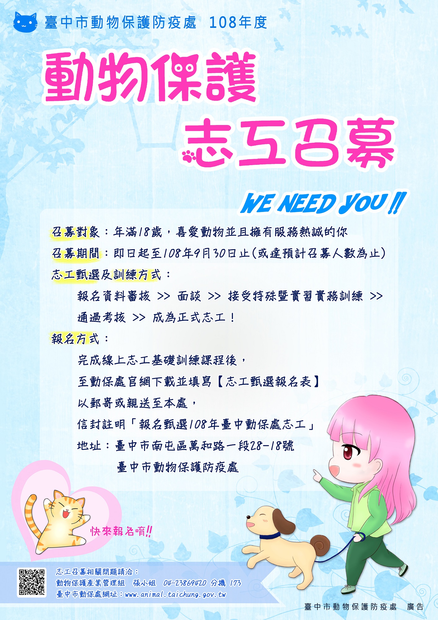 動保處指出,動保志工召募時間自即日起至930日止,年滿18歲者均可報名,報名相關資訊請上網站 http://bit.ly/2UkpVTg 查詢。(4/15*13)*農業局