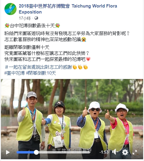 影片已上傳至台中花博臉書粉絲專頁 https://zh-tw.facebook.com/2018taichungexpo/ ,不少民眾上網留言,「熱情的志工!謝謝你們」、「超級友善的志工!輕聲細語真的很了不起」、「台中花博參觀,感受到志工們滿滿的熱情」,也歡迎大家一起支持,一起說出對志工的感謝。