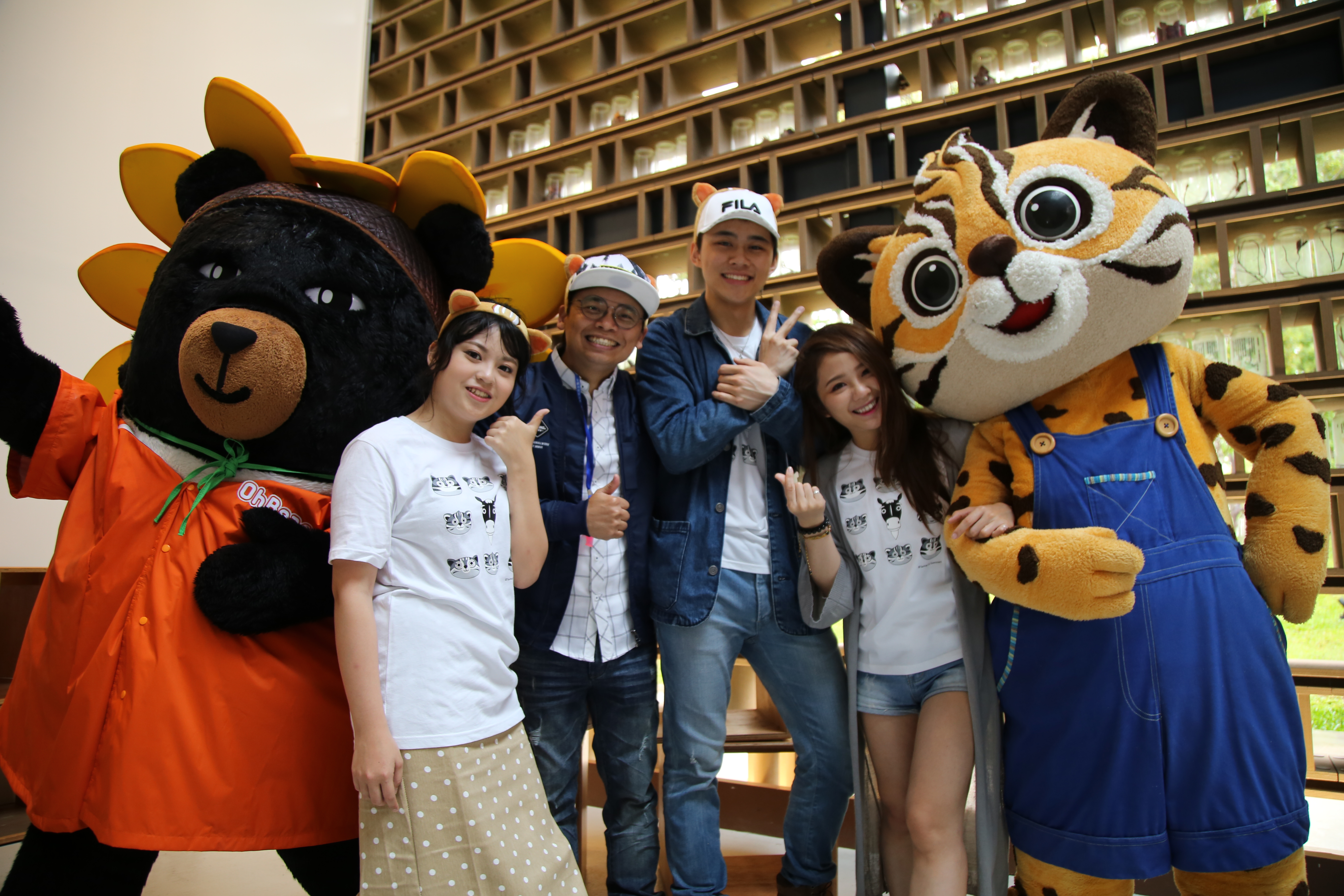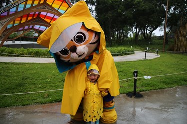 台中花博進入倒數,參觀人數即將突破700萬大關,交通部觀光局吉祥物「喔熊」今(16)日也把握機會光臨后里森林園區,與石虎家族的弟弟「來虎」相見歡,進行一場限時尋找花博15大亮點的直播挑戰賽,競賽過程中雖然陰雨綿綿,但兩位網紅吉祥物仍身穿雨衣、雨鞋穿梭園區努力找亮點,萌樣十足,吸引許多遊客駐足拍照,為他們加油打氣,氣氛溫馨熱鬧。