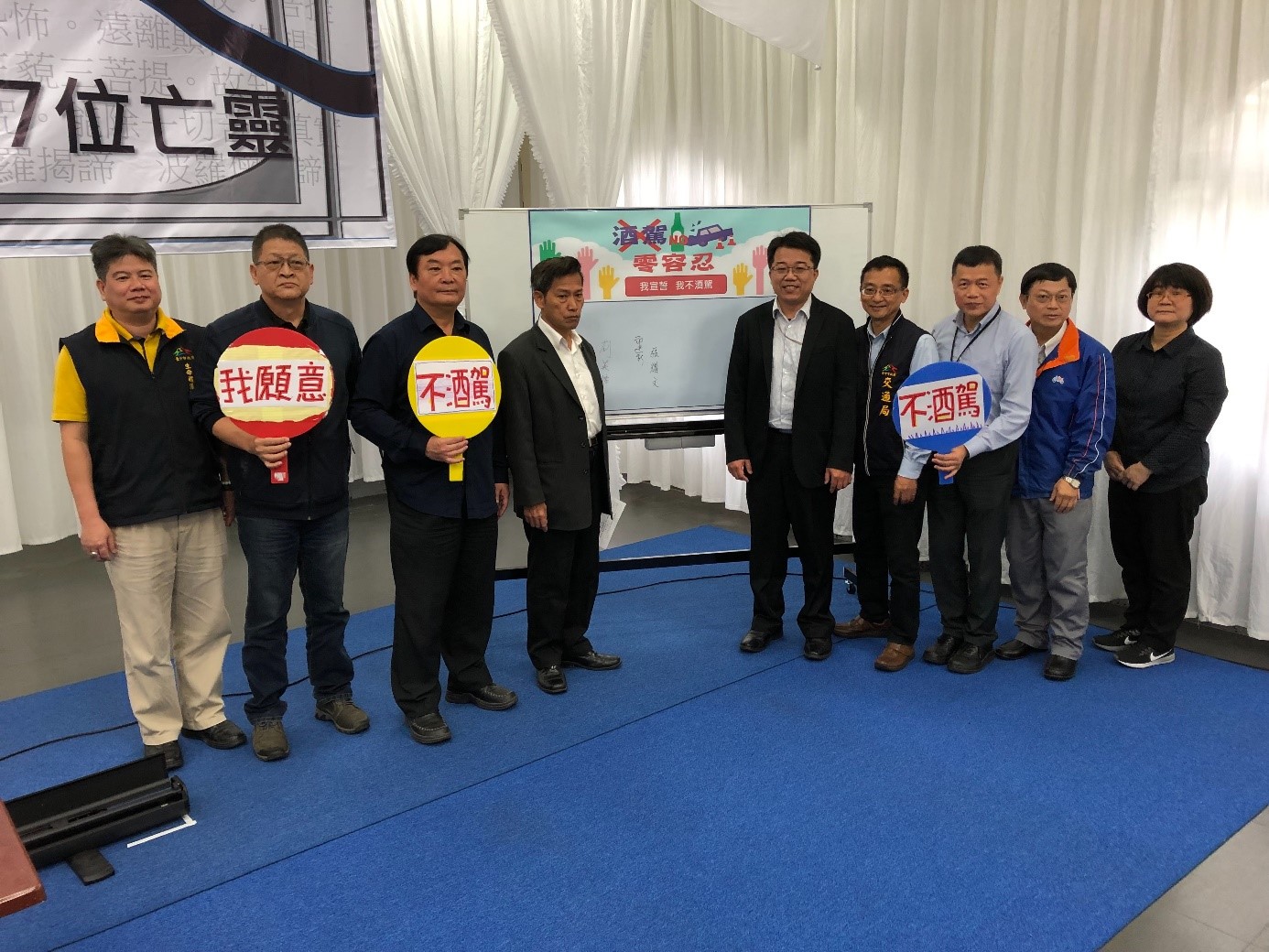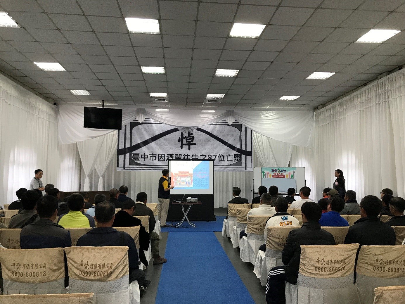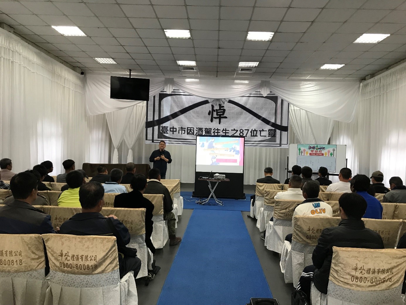 今日酒駕再犯道安講習在崇德殯儀館舉行,現場除懸掛輓聯並放置一具冰櫃,布置成告別式會場,由館方介紹大體入館流程,台中區監理所長劉英標、交通局主秘郭志文、生命禮儀管理處長劉振村一同簽署酒駕零容忍宣言,宣誓台中市積極防制酒駕的決心;最後由仁德醫護管理專科學校生命關懷事業科教授邱達能進行生命教育課程,希望酒駕再犯者重新認識生命的可貴,進而降低再犯機率。