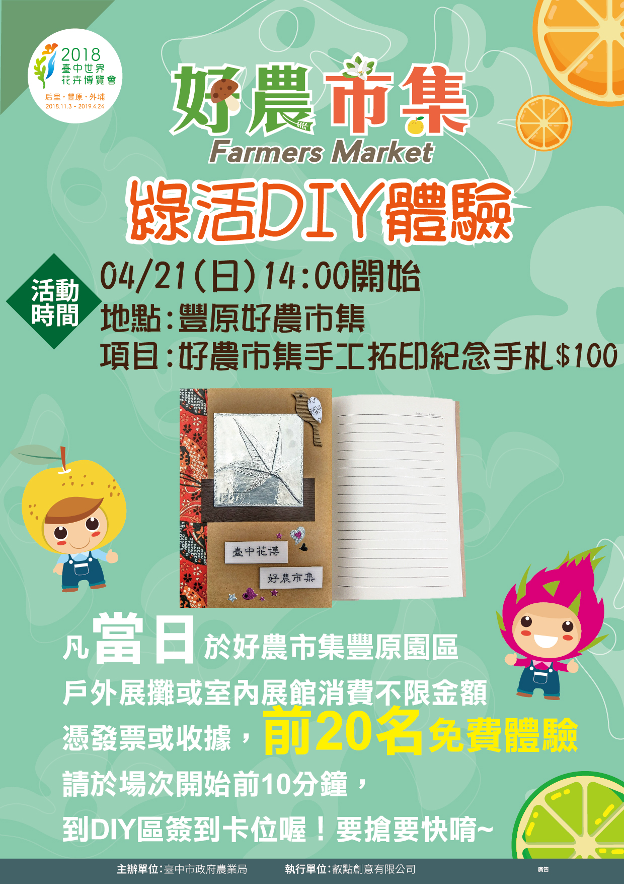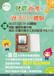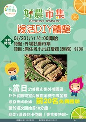 更多「綠活DIY體驗」活動資訊,可至「2018台中花博好農市集」臉書專頁(https://www.facebook.com/2018taichungexpo.farmersmarket/) 查詢。